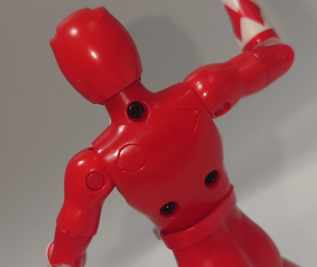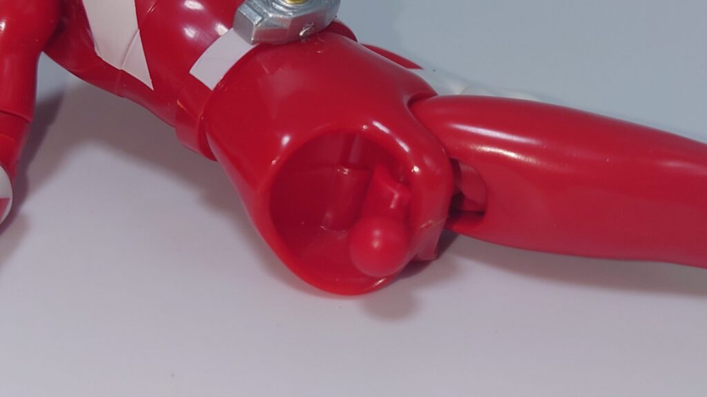 腕部は手首や上腕がロール可能。しかし肘が90度しか曲がらず、同じ廉価版フィギュアでも仮面ライダーアクションフィギュアとの差を感じてしまう箇所