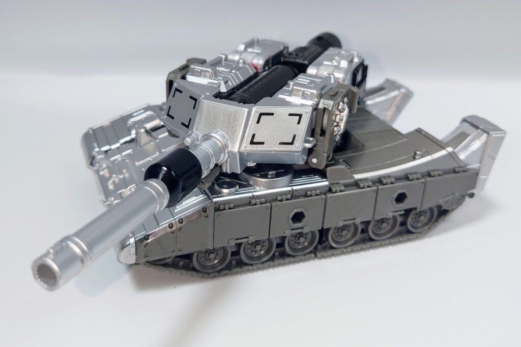 銀塗装が眩しいタンクモードに。メガトロンは初代アニメでは銃に変形していましたが最近は戦車でのリメイクが当たり前になってしまいました
