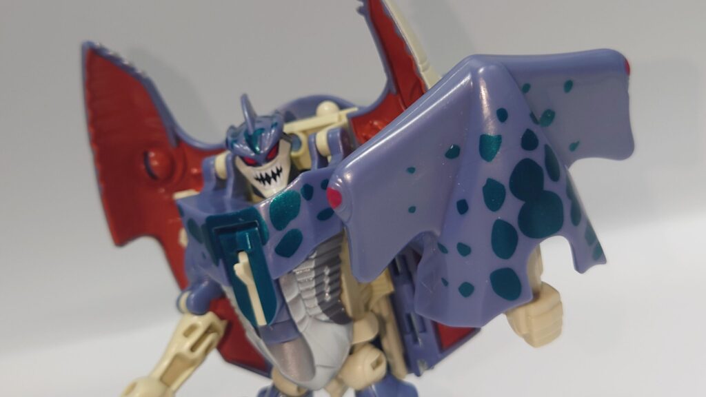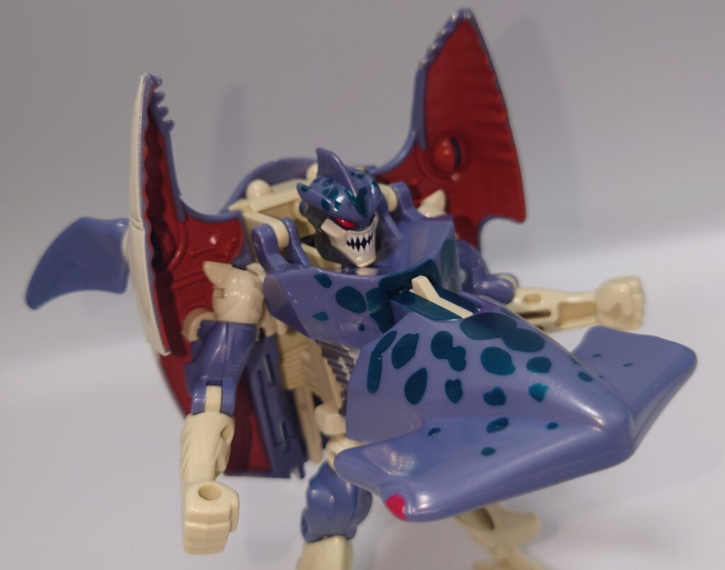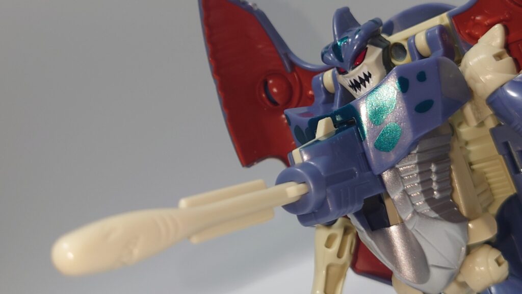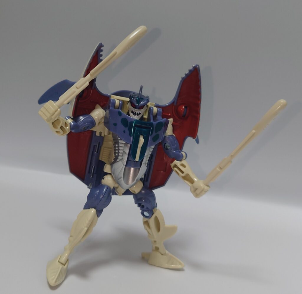 可動はかなり厳しいものの一癖あるデザイン、綺麗な塗装や多数のギミックは現在のアクションフィギュアと化したTFに慣れているとよくも悪くも玩具らしいため懐かしさを感じます。アニメでの登場は無かったのでこちらはリメイクされないのかなぁ?
