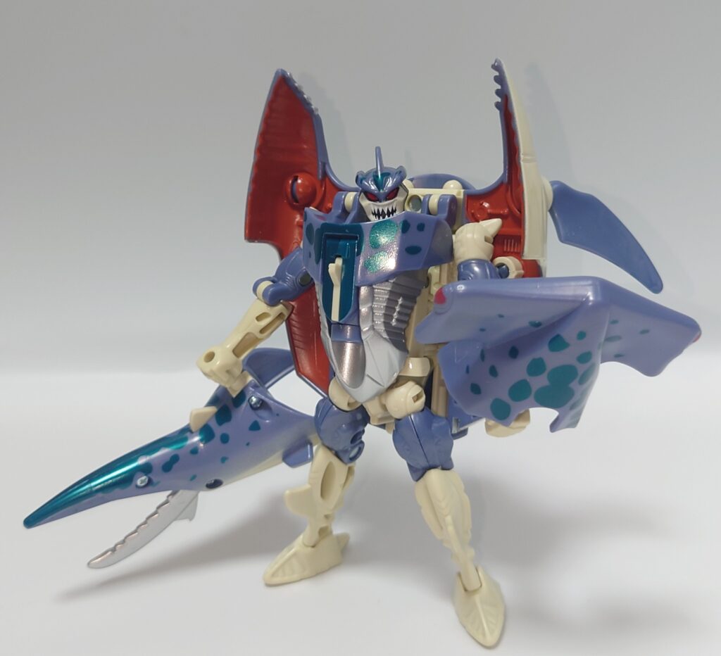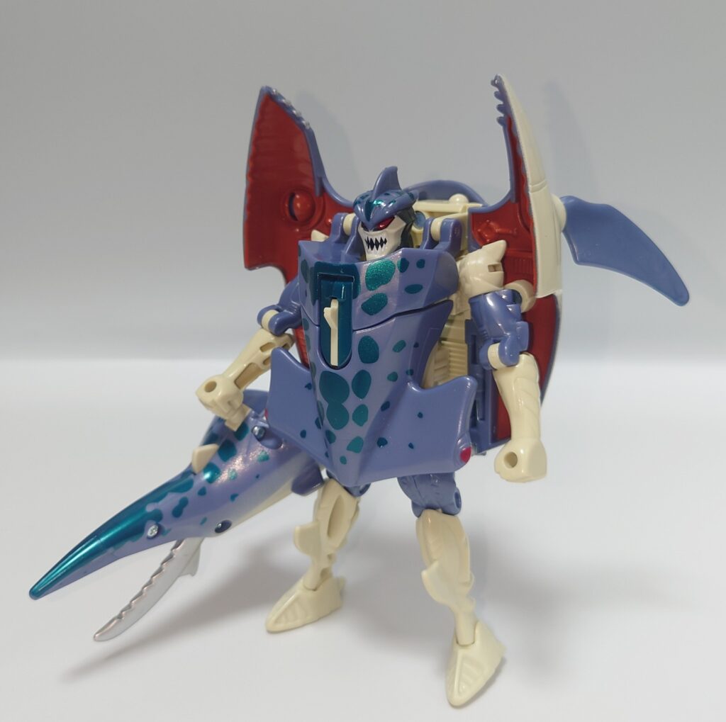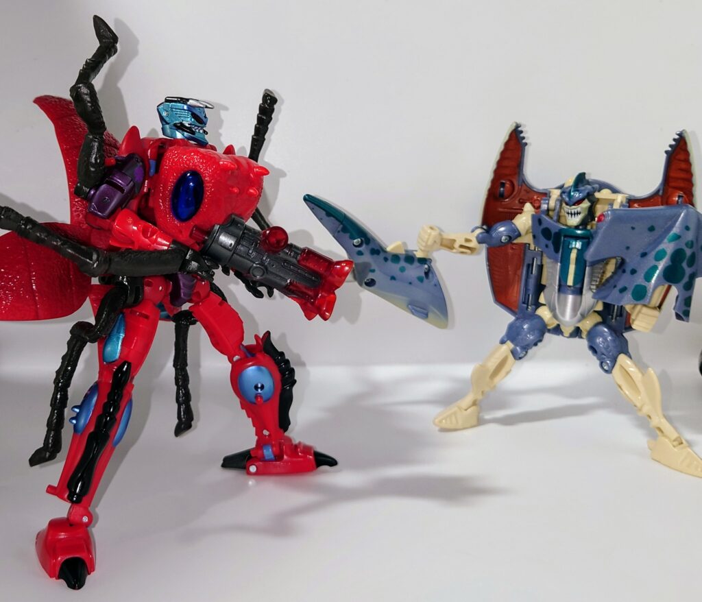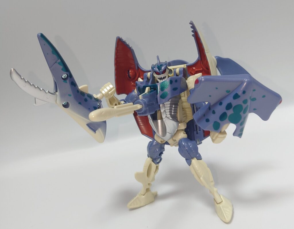 可動はかなり厳しいものの一癖あるデザイン、綺麗な塗装や多数のギミックは現在のアクションフィギュアと化したTFに慣れているとよくも悪くも玩具らしいため懐かしさを感じます。アニメでの登場は無かったのでこちらはリメイクされないのかなぁ?