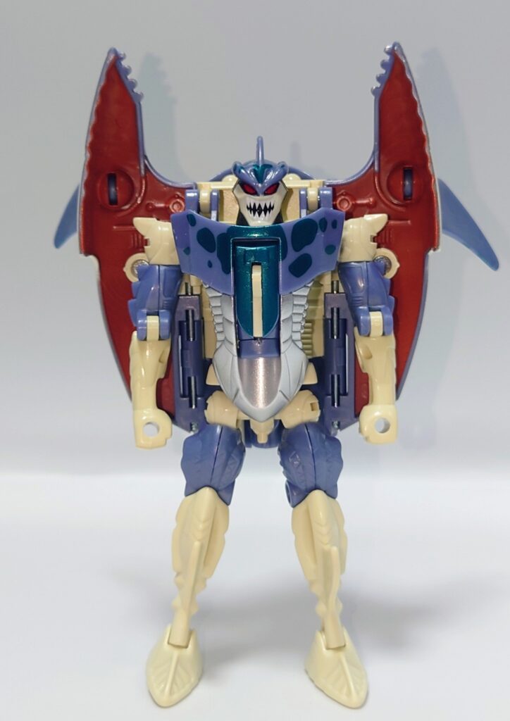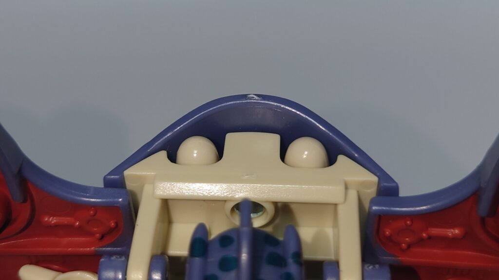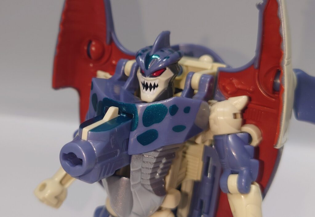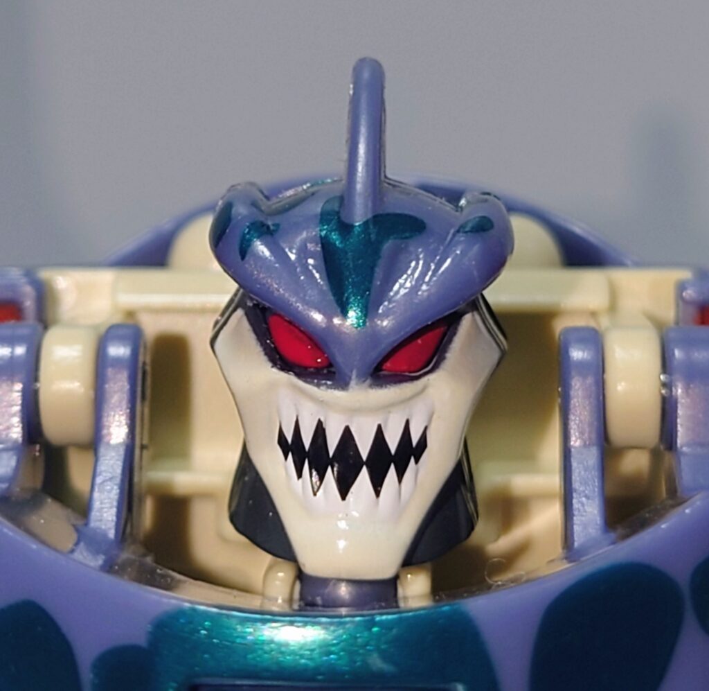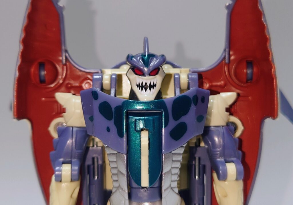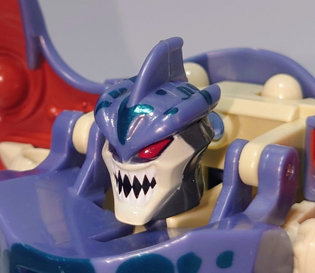 頭部。ビーストウォーズ特有の荒々しい顔でシリーズの中でも鋭い牙を剥き出しにした恐ろしい形相