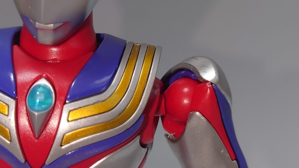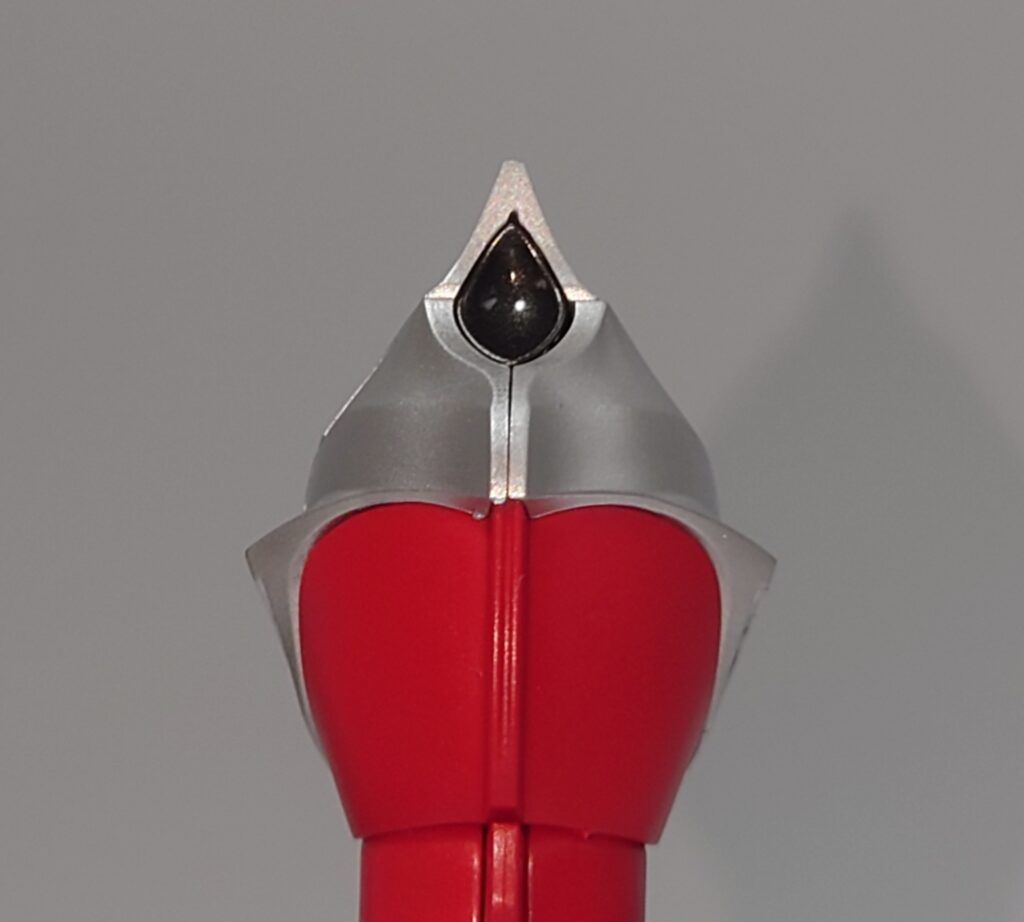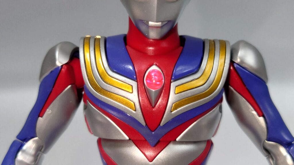 頭部。今まで触ってきたティガの立体物の中では最高クラスの完成度。目の偏光素材がいい味出しています。額の菱形クリスタルもしっかり色分けされ、初期アイテムのトリガーと比較しても飛躍的に進歩していると感じます