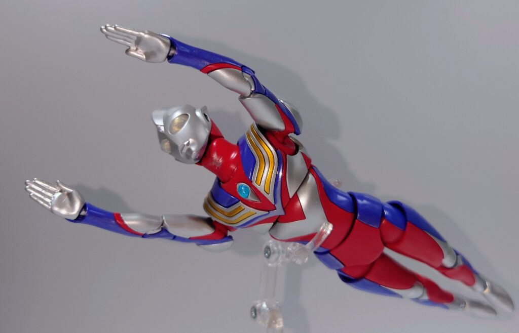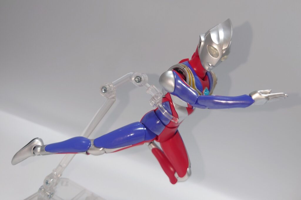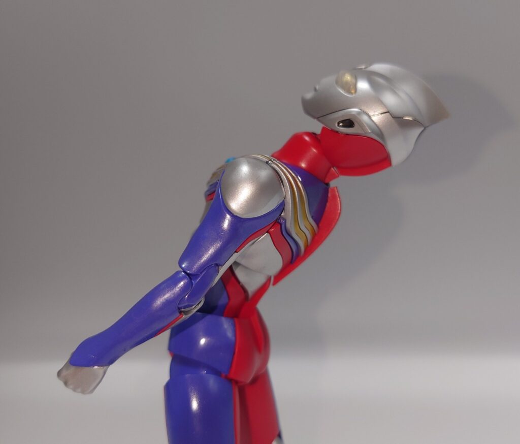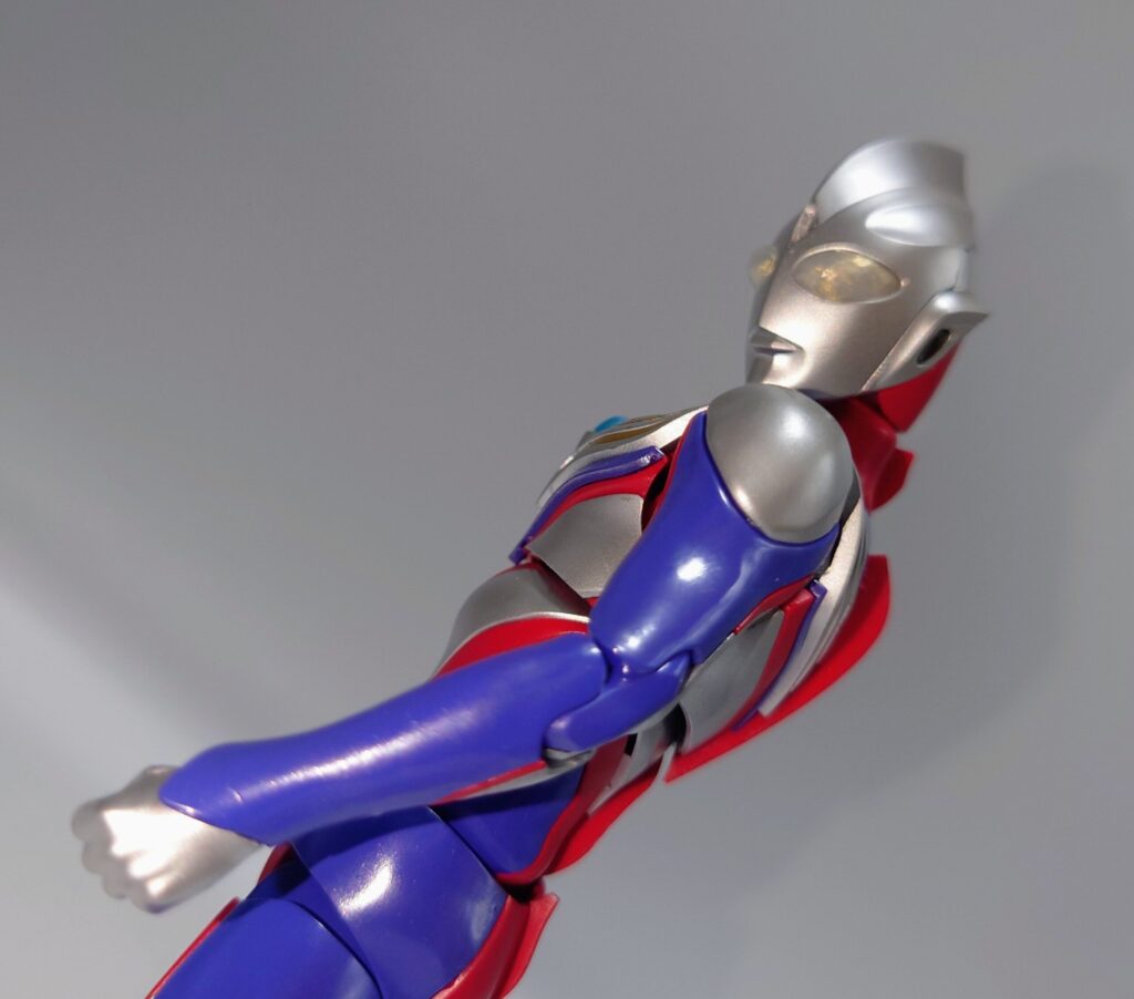 各部可動は上腕のロールが色分け再現の都合上再現できない以外はなかなかの可動範囲を誇ります。しかし腕周りのポーズが制限されるのは光線技が必殺技のウルトラマンフィギュアとしては辛い…