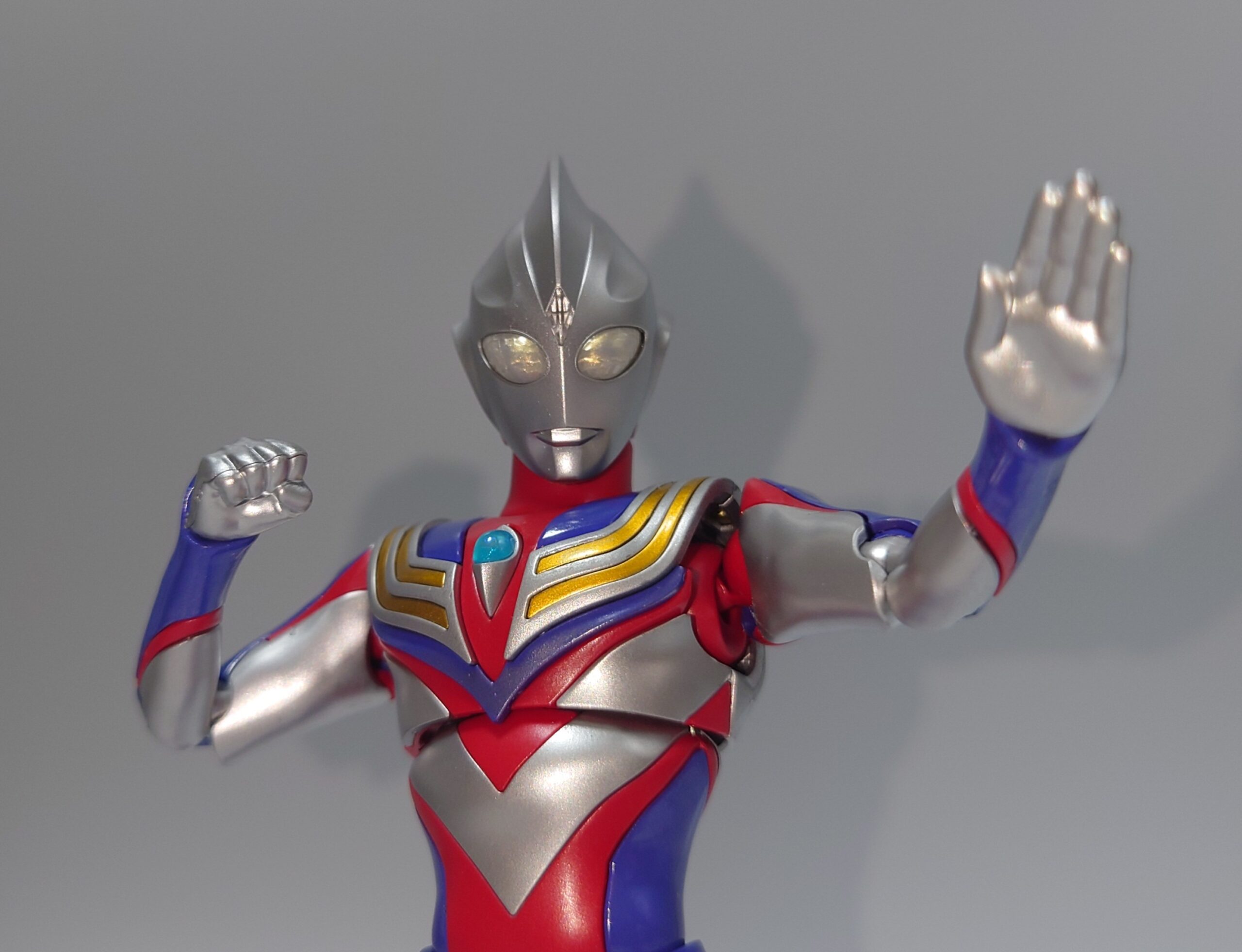 頭部。今まで触ってきたティガの立体物の中では最高クラスの完成度。目の偏光素材がいい味出しています。額の菱形クリスタルもしっかり色分けされ、初期アイテムのトリガーと比較しても飛躍的に進歩していると感じます