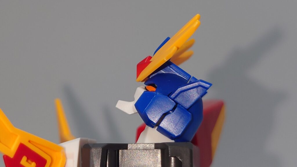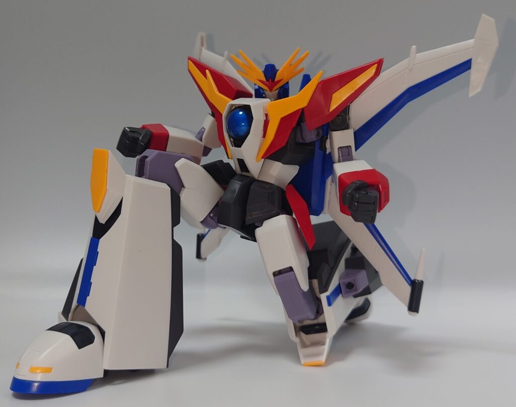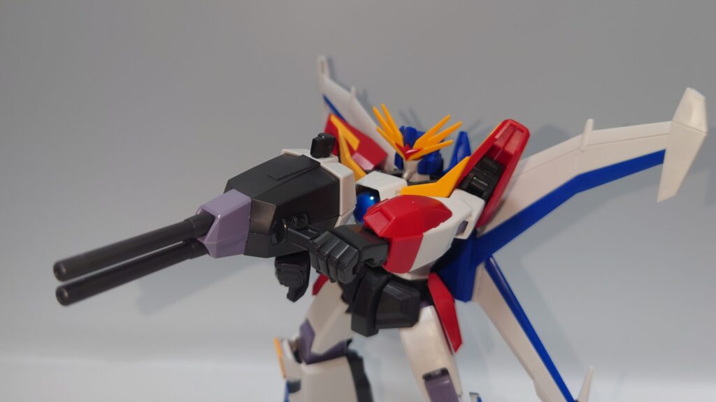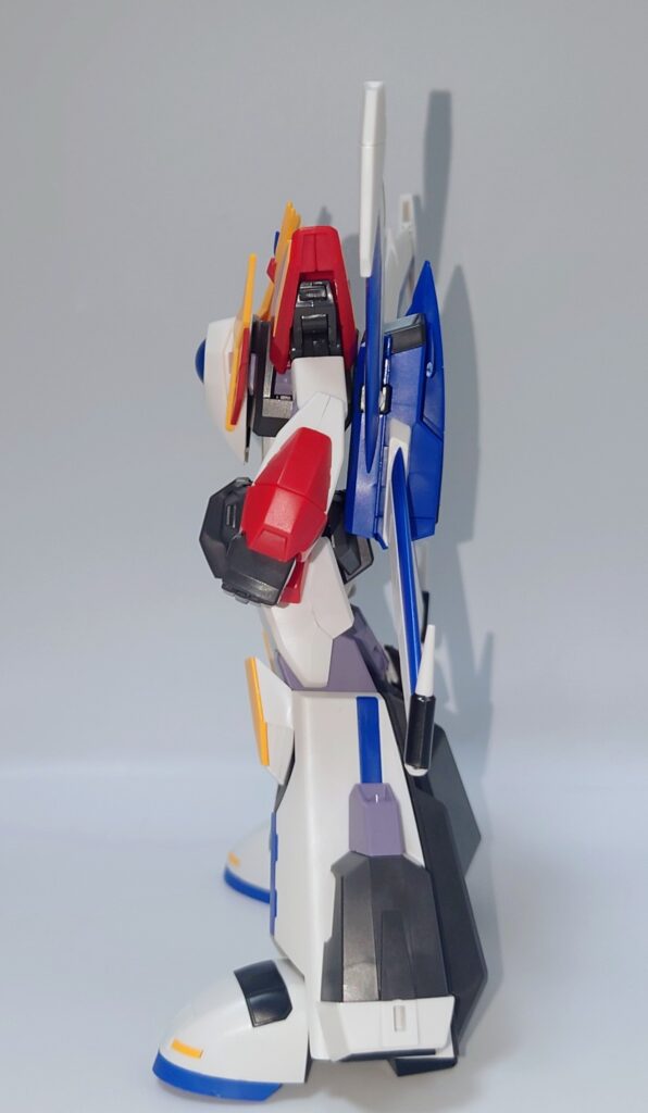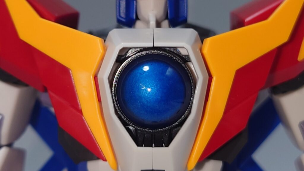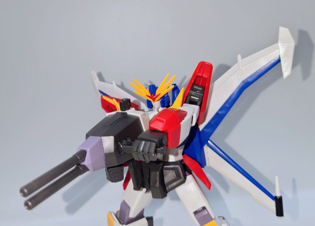 下方ウイング端のガンメタはマスキングによる塗装で本来は色分けされていません。他には胸部クリスタル、ブレストアースバスター部をメタリックカラーで塗装しました