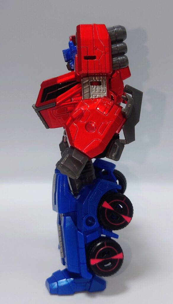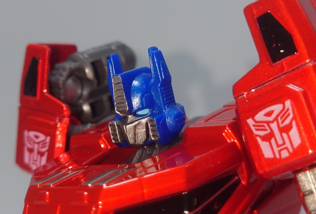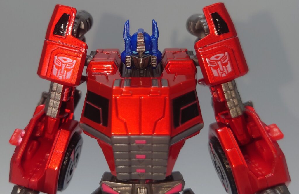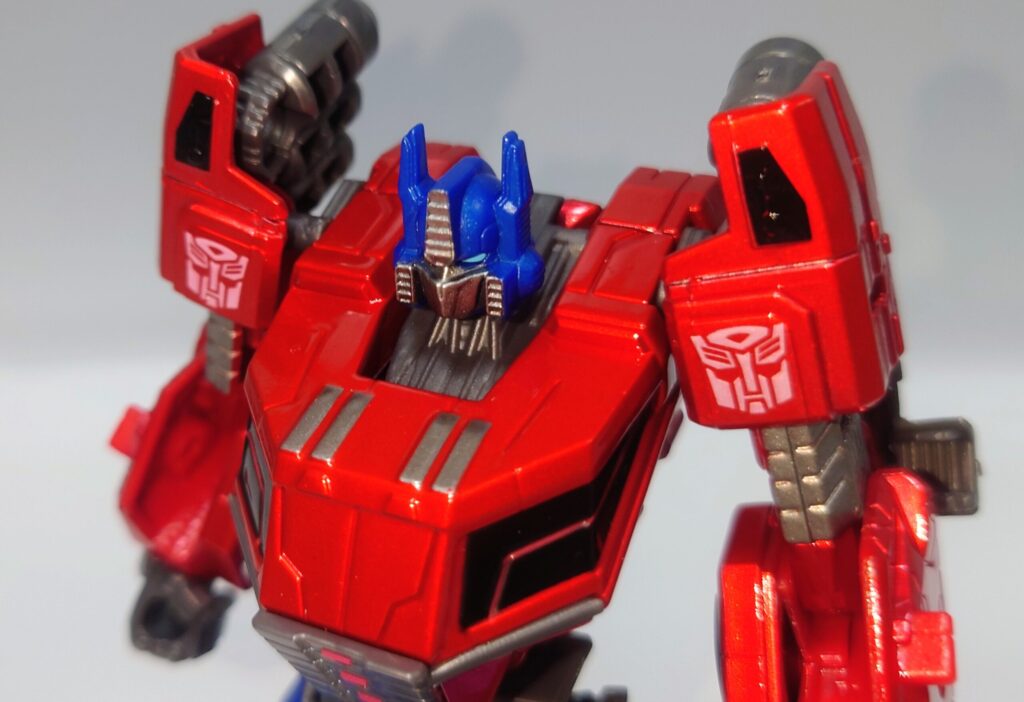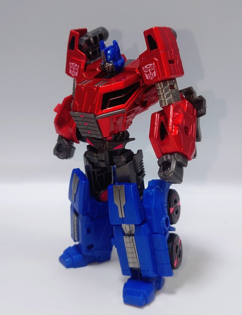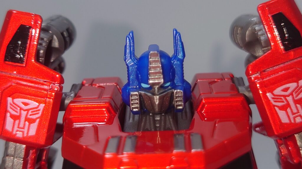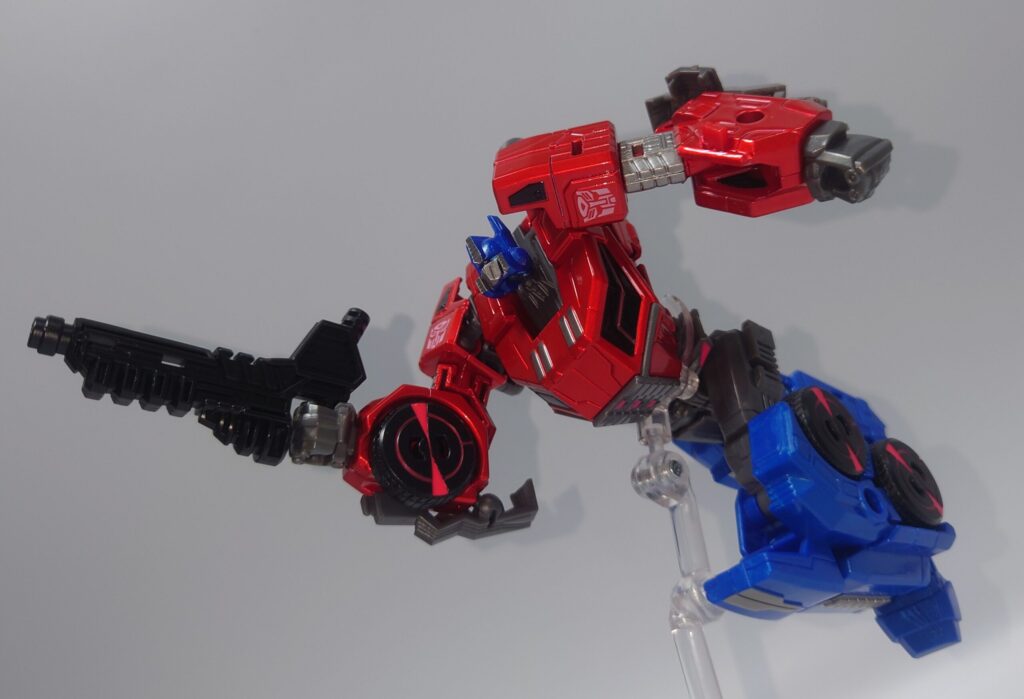 UNオプティマスと比べると流線型から直線的な形状に変更され無骨なバトルカーといった見た目に。派手なキャンディ塗装が目を引くものの筆者の個体は目立つ箇所に傷が…クリアレッドでリタッチするかな?