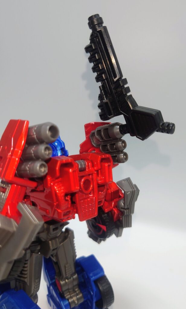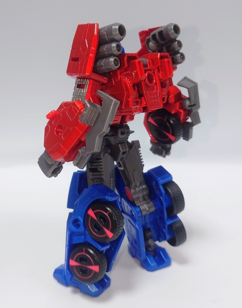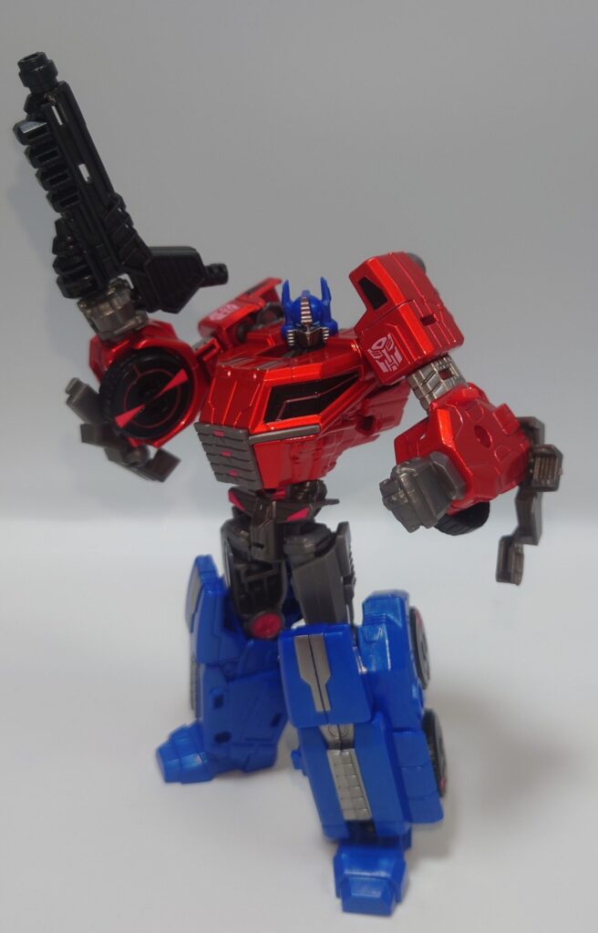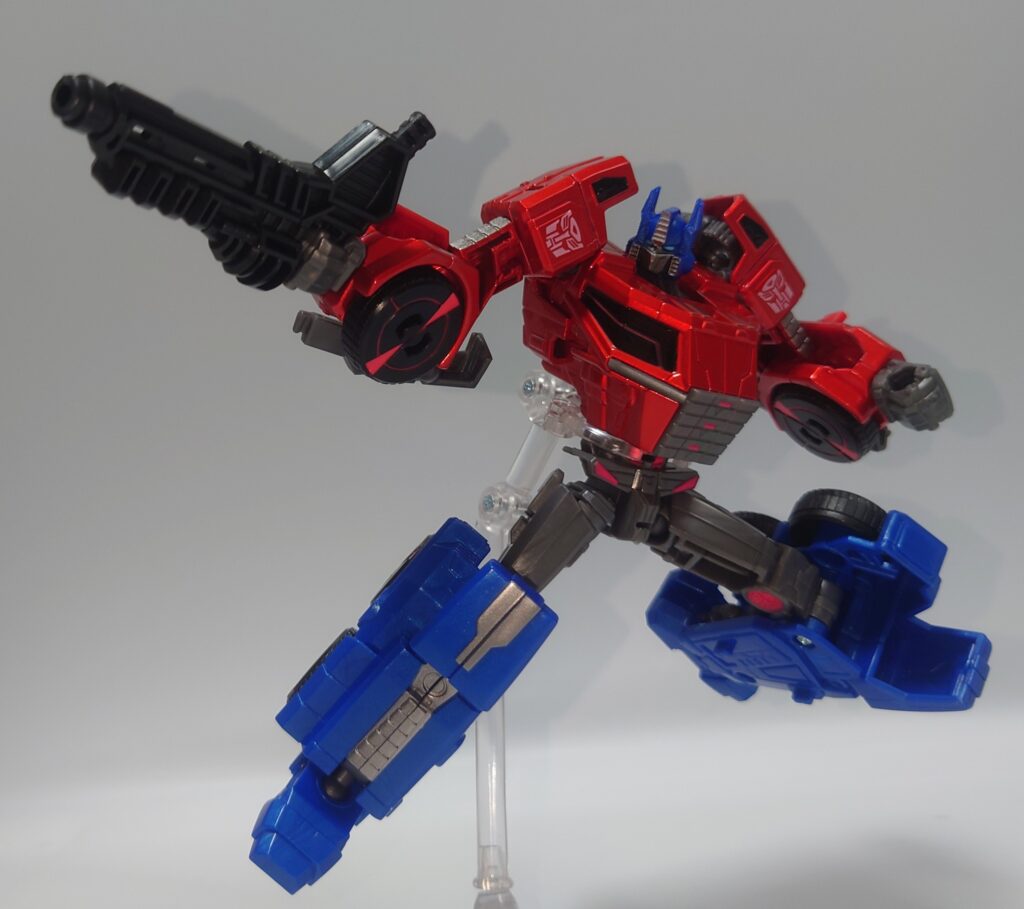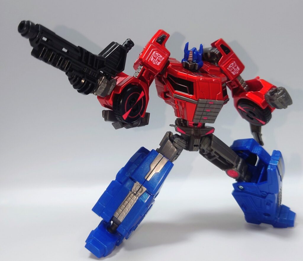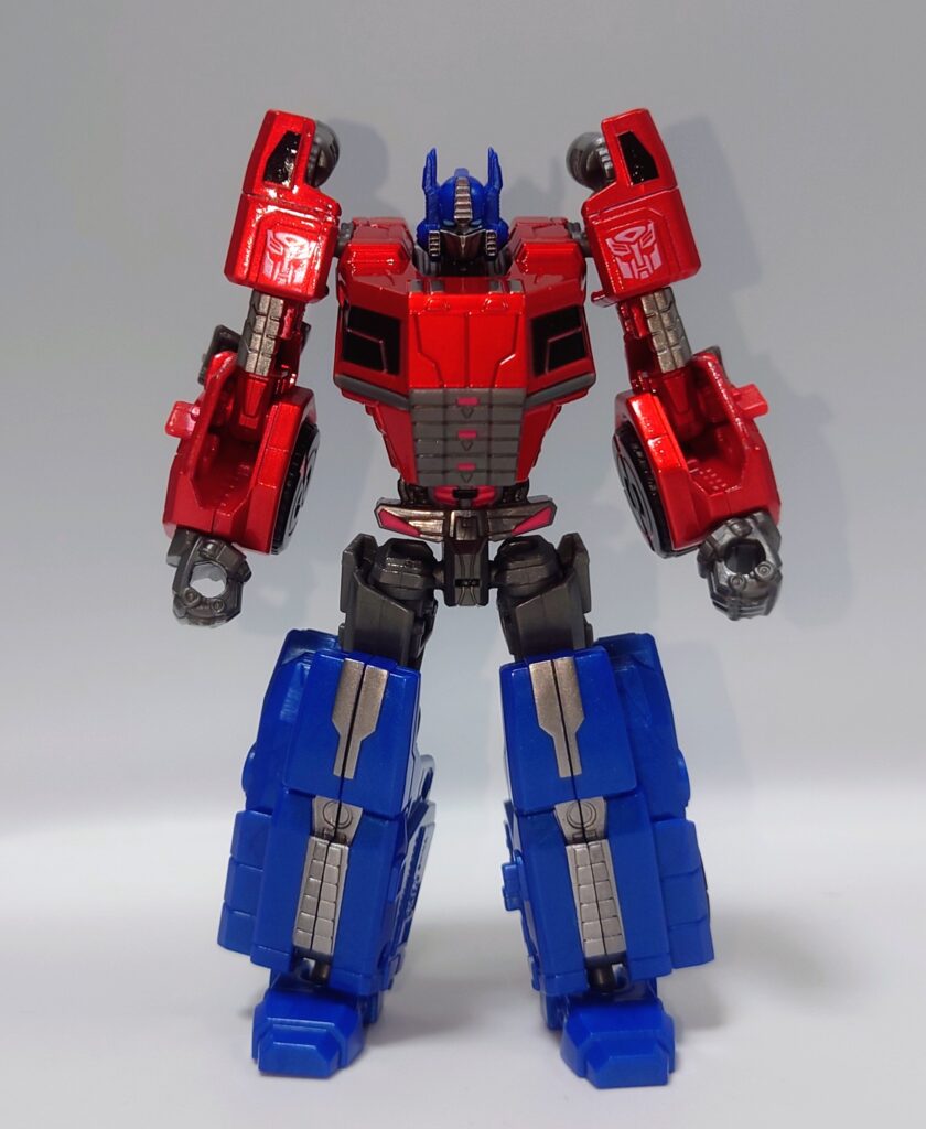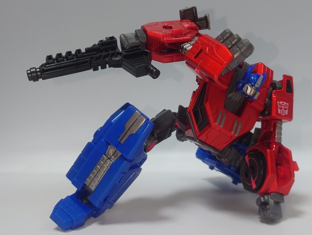UNオプティマスと比べると流線型から直線的な形状に変更され無骨なバトルカーといった見た目に。派手なキャンディ塗装が目を引くものの筆者の個体は目立つ箇所に傷が…クリアレッドでリタッチするかな?