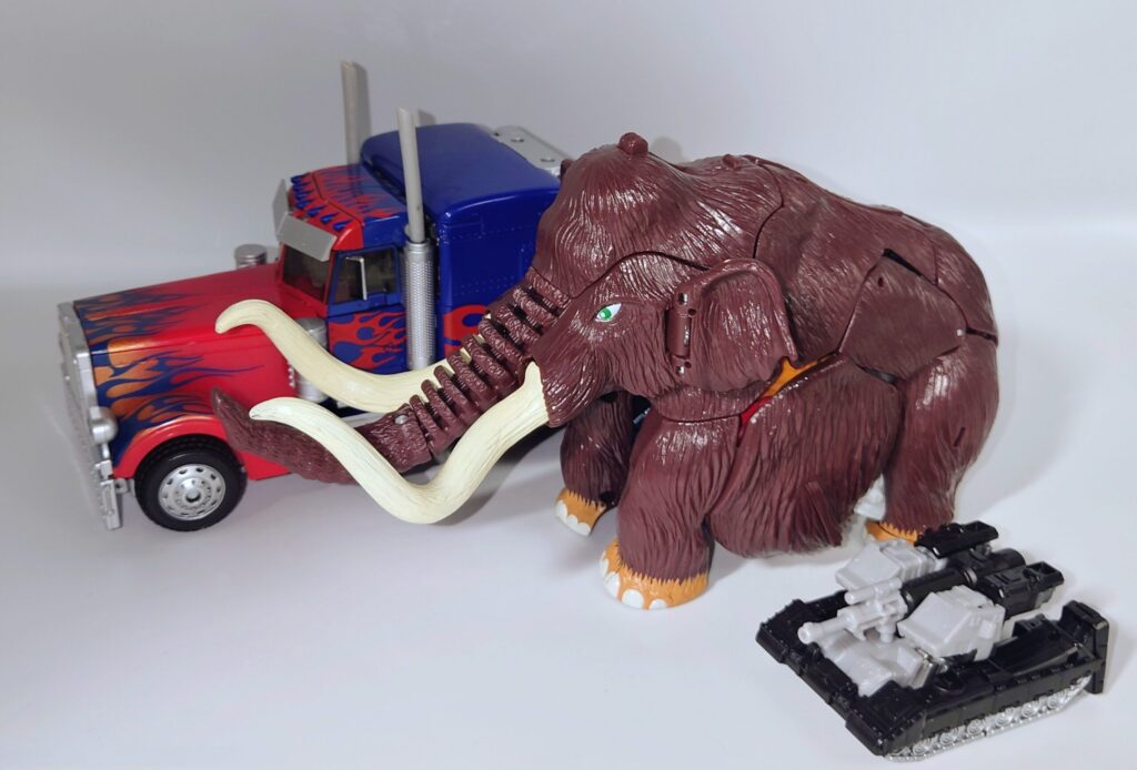 手近にあったトランスフォーマーで大きさ比較。MBオプティマス(2017)とシルバータンクメガトロン(2025)大きさがわかると思います
