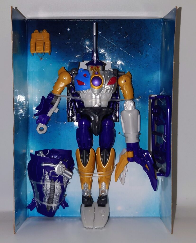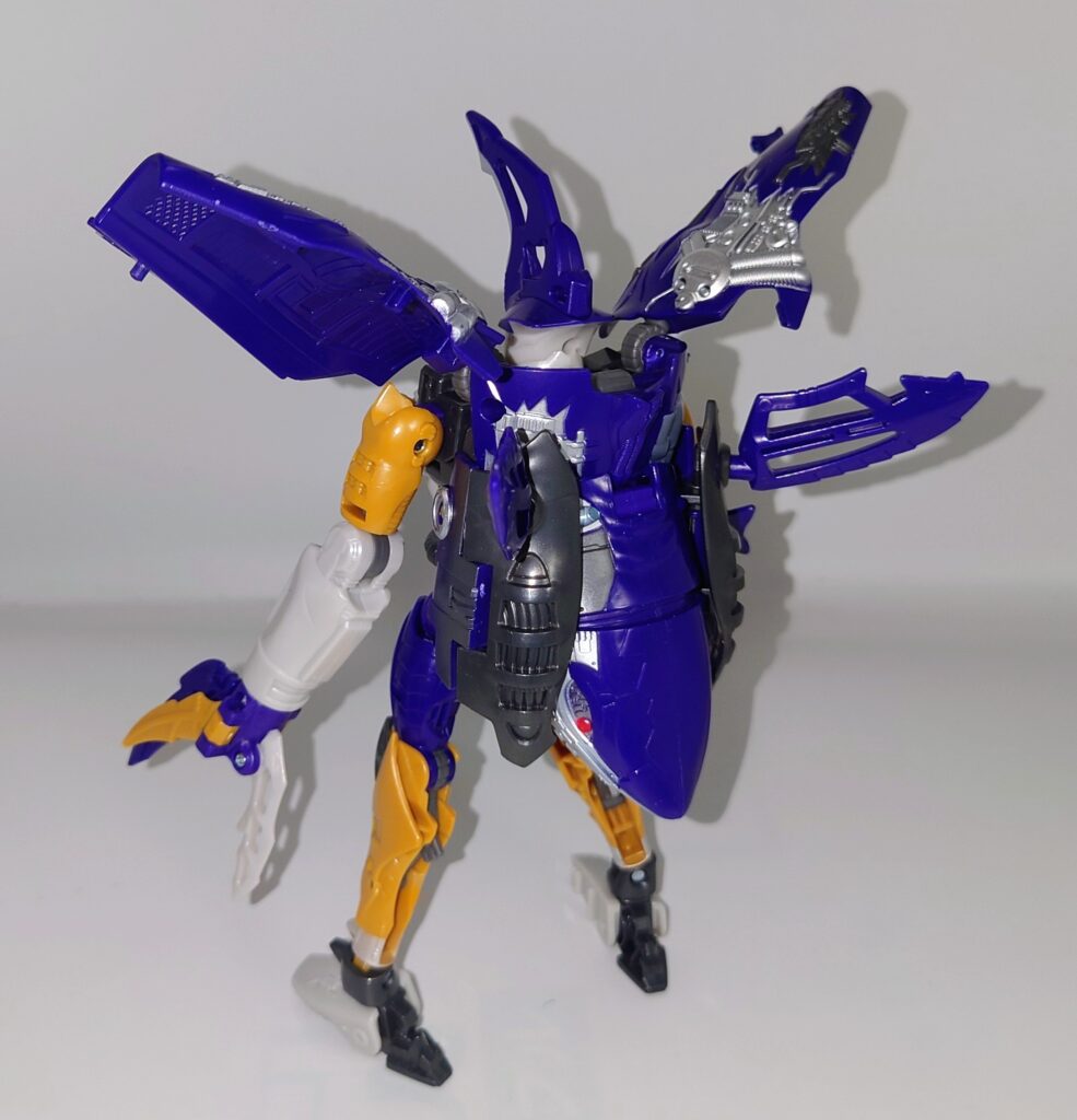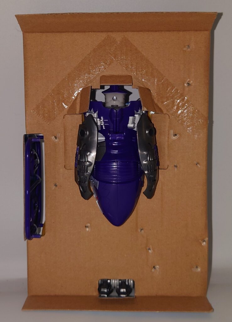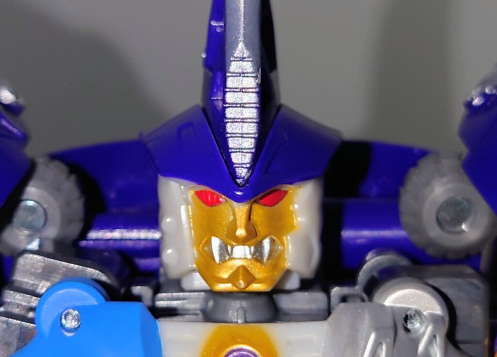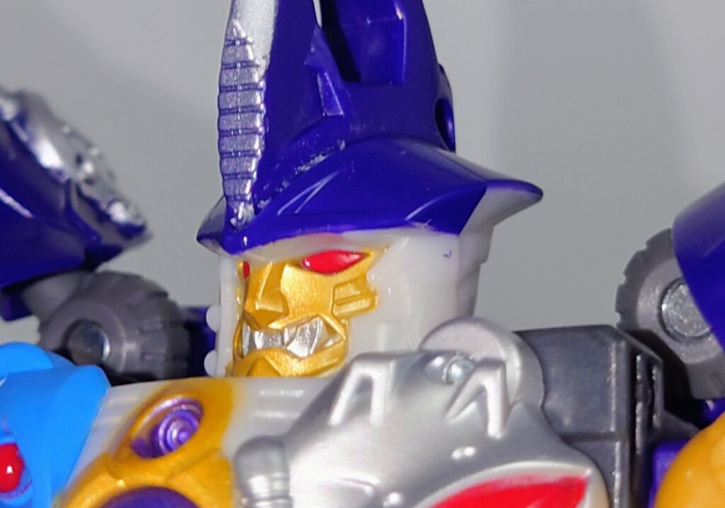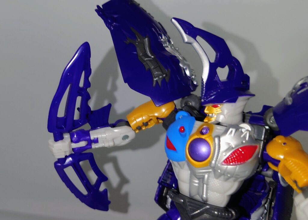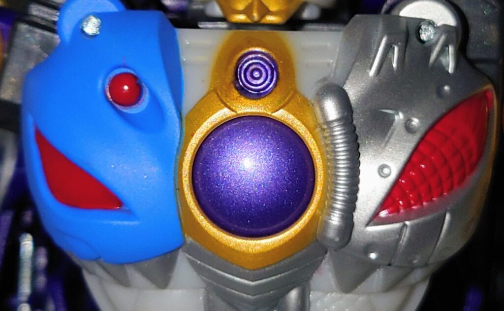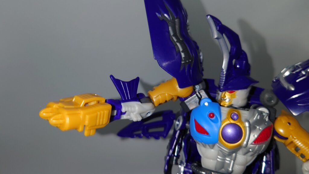 胸のクリアパーツはクリスタルではなくメタリックパープルでの塗装に。プレタゴンズ(デストロン)のエンブレムの意匠はなし
