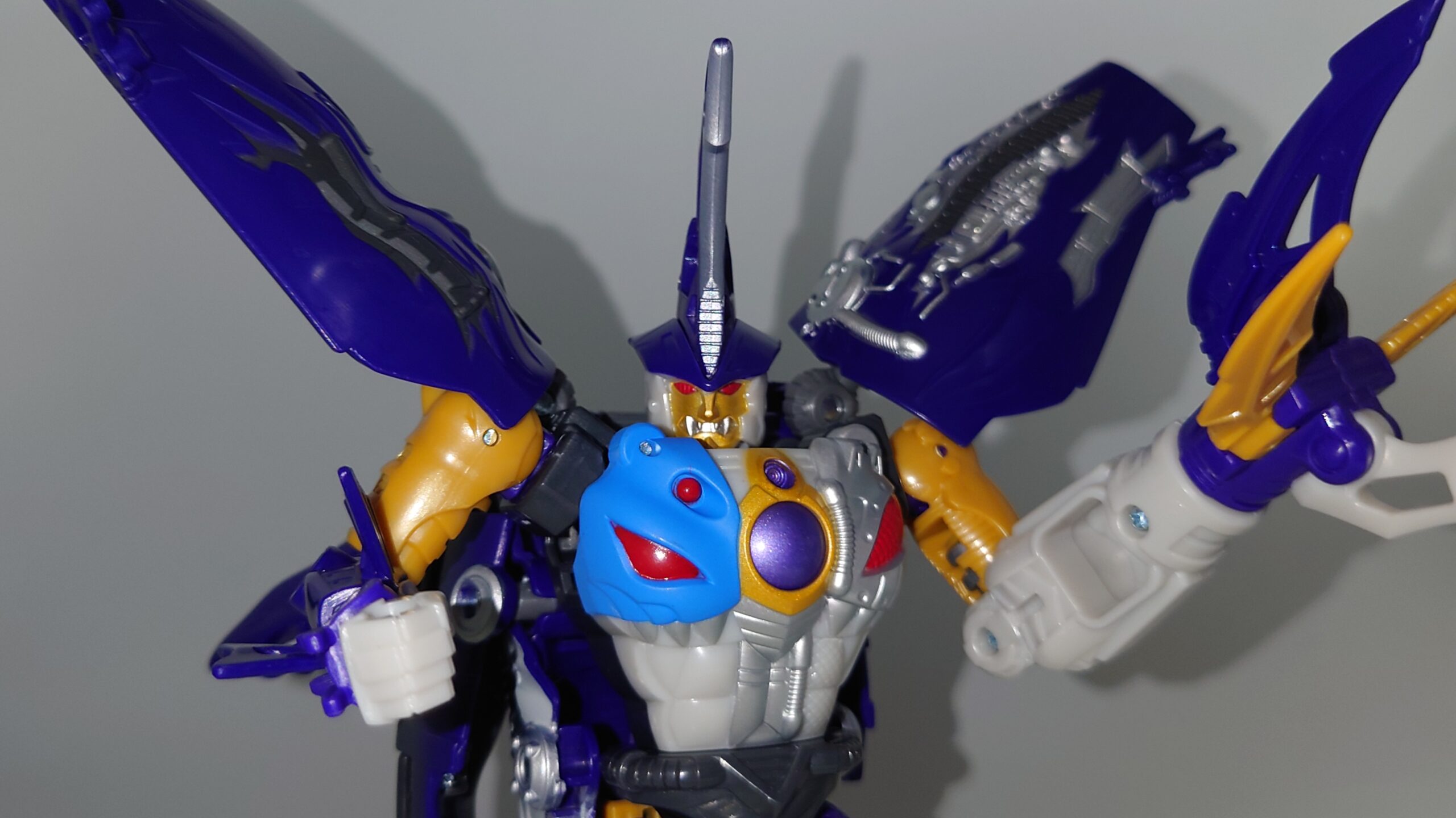 胸のクリアパーツはクリスタルではなくメタリックパープルでの塗装に。プレタゴンズ(デストロン)のエンブレムの意匠はなし