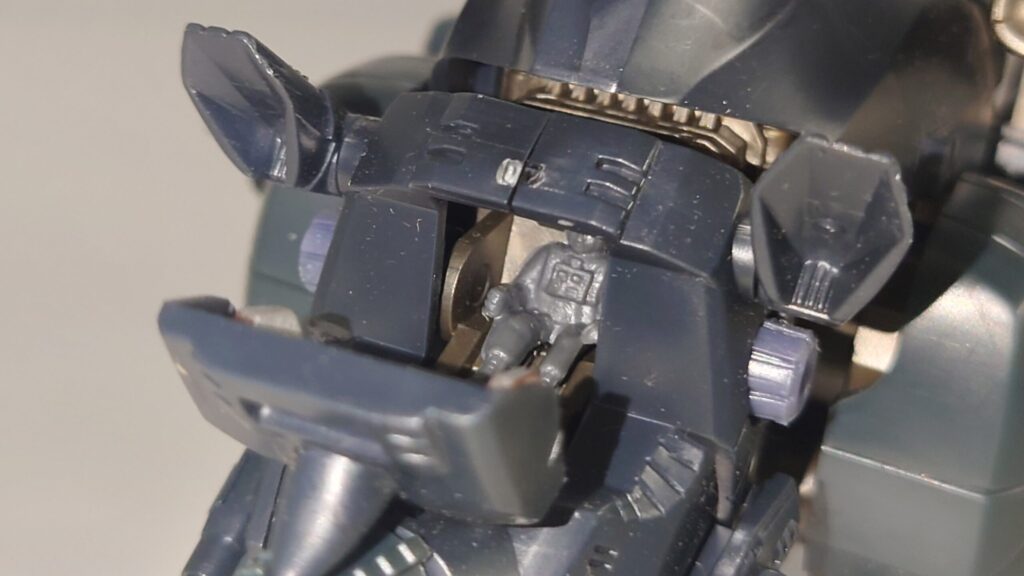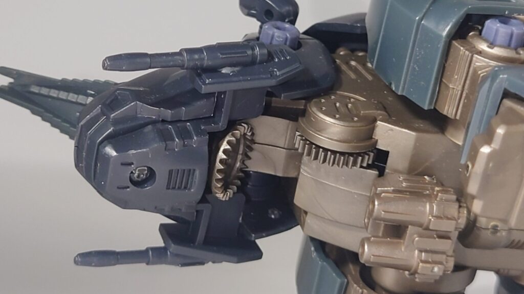 頭部の下にギアが設けられています。そこで歩行時に首を下げて2つのギアを組み合わせる事で突撃戦用超硬度ドリルを回転させながら歩行します