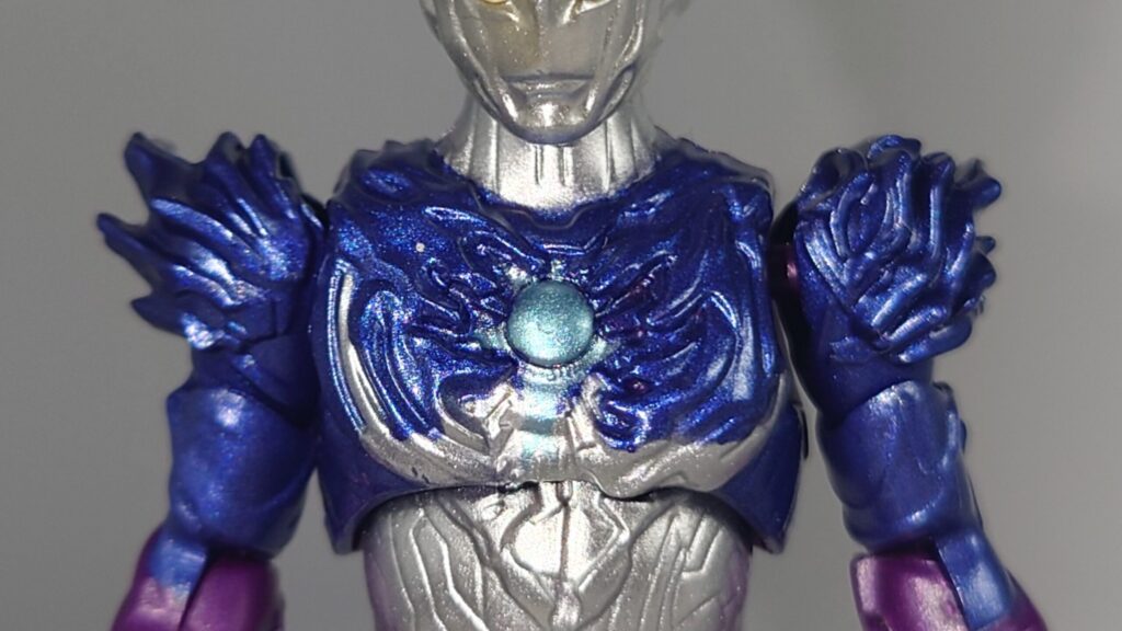 ウルトラマンではおなじみの赤色が存在せず寒色系の配色になっています。塗装が結構省略されたのかなぁ?て思い軽く調べてみたのですが腹部ガンメタルのグラデーションが省略されている以外は割とイメージ通りかと思います。アーツ等を見ているとソフビと比較しても割と再現されているかと。前者より明るいカラーリングです