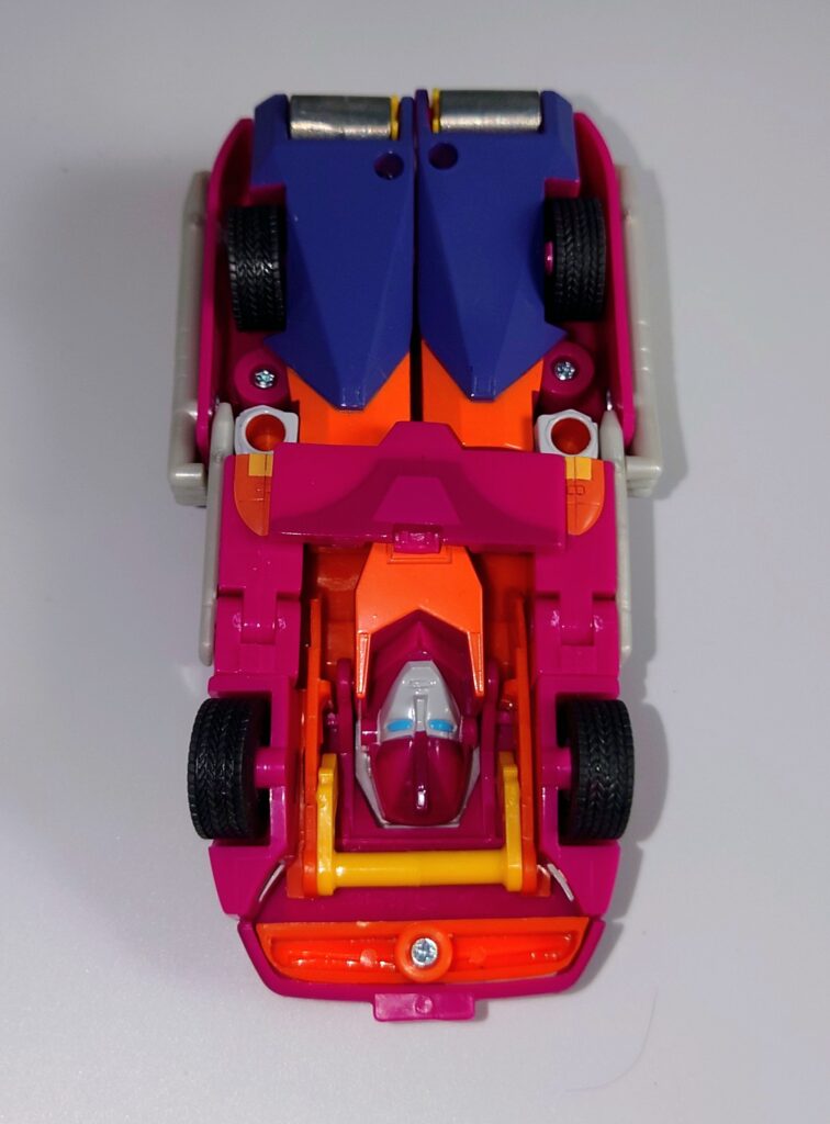 色鮮やかなフューチャースポーツカー。ボンネットのファイヤパターンが目を引きますがレトロ復刻シリーズはすべて塗装で再現されシールレス仕様。なぜ日本では売らないのか…?