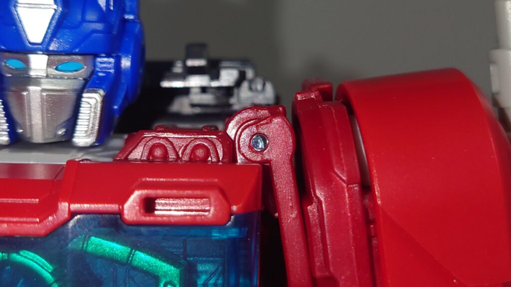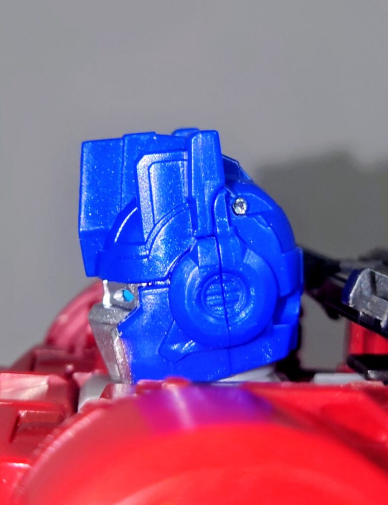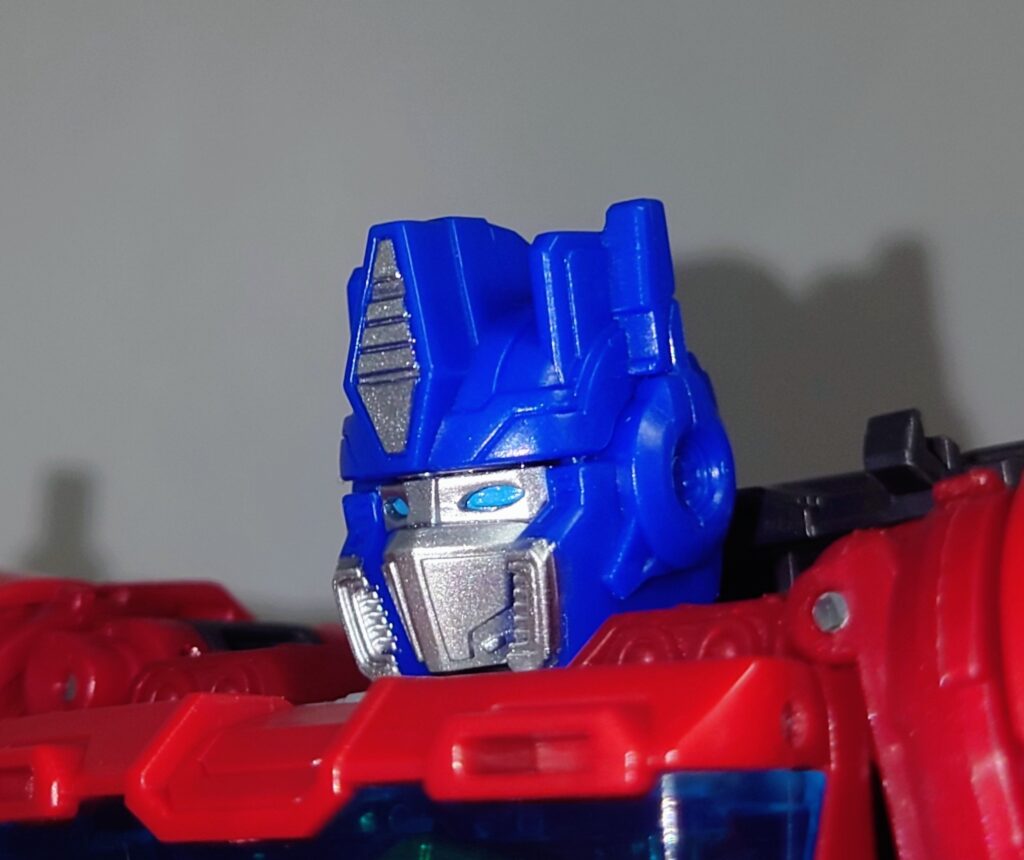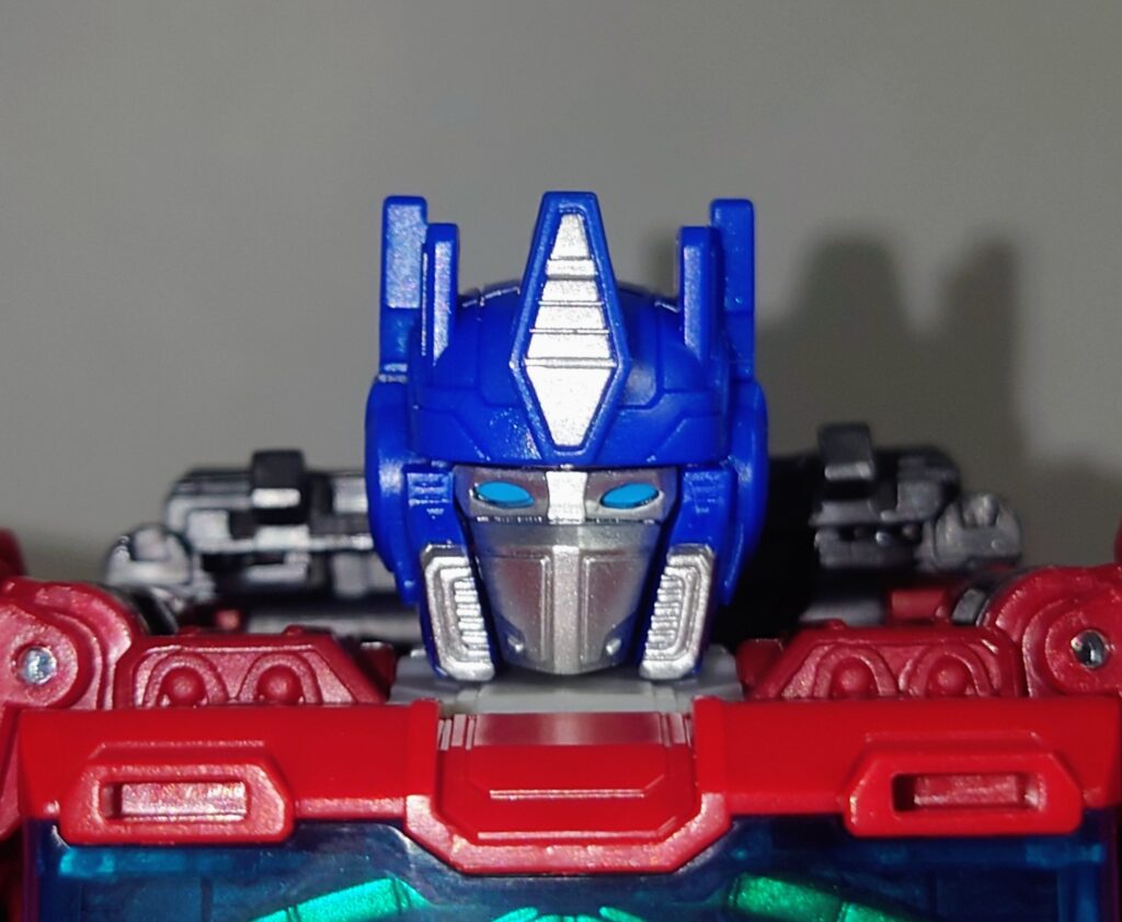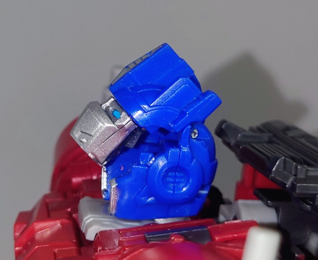 頭部。目の部分が大きめで優しい目つきのフェイス、本作のオプティマスは元々民間人だったゆえでしょう