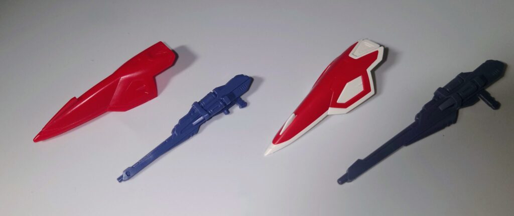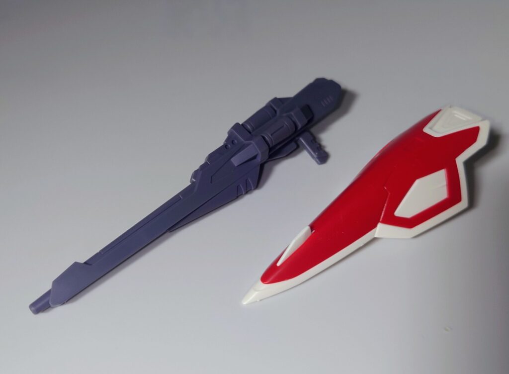 バスターライフル、シールドが付属。2つとも2パーツ成型ですがシールドのセンサー部分は色分けされていません。まぁ、アニメでも省略されがちなパーツだったからいいのか…