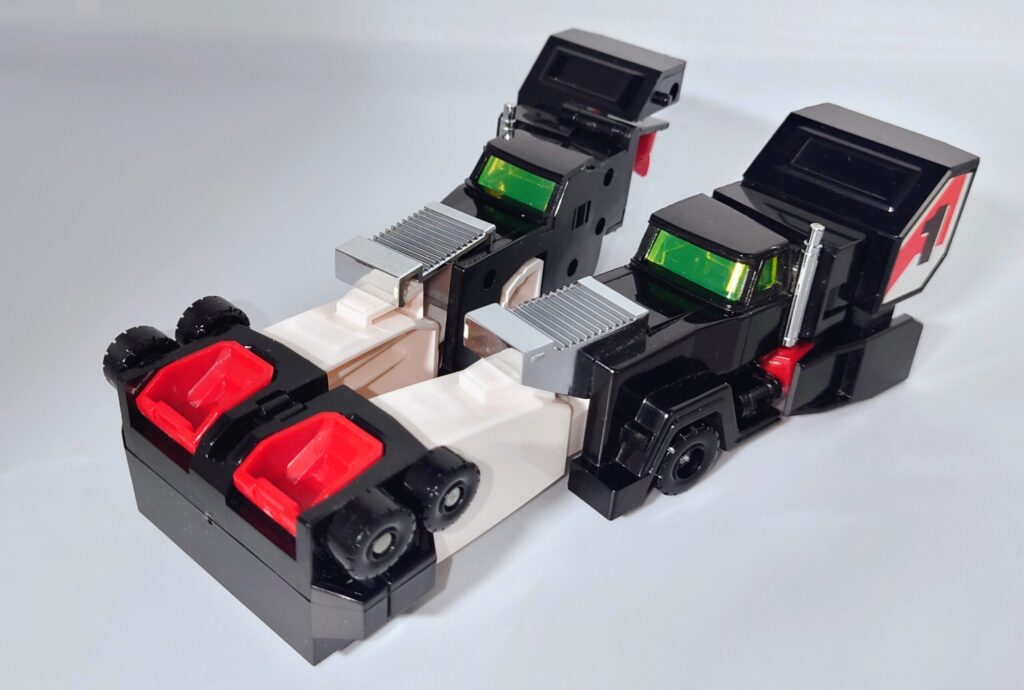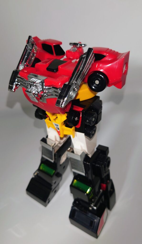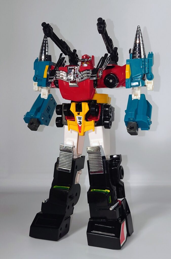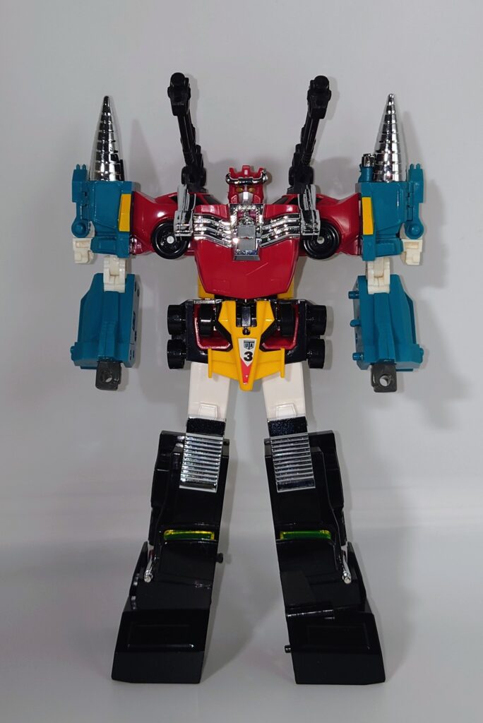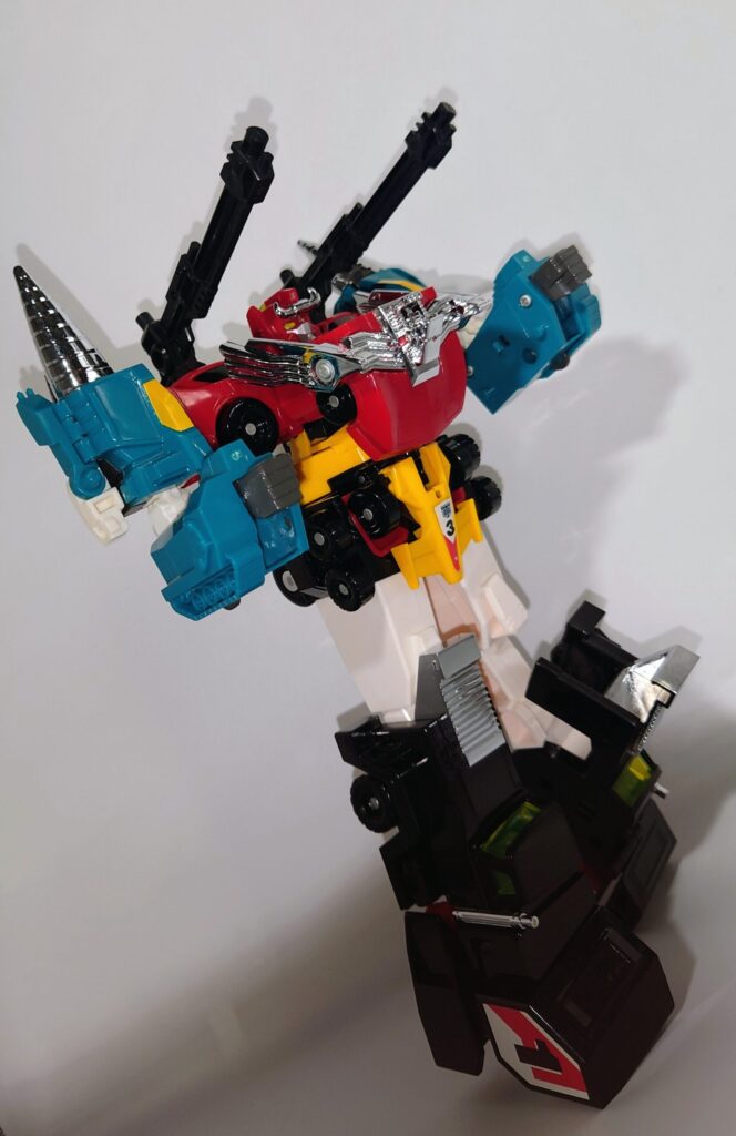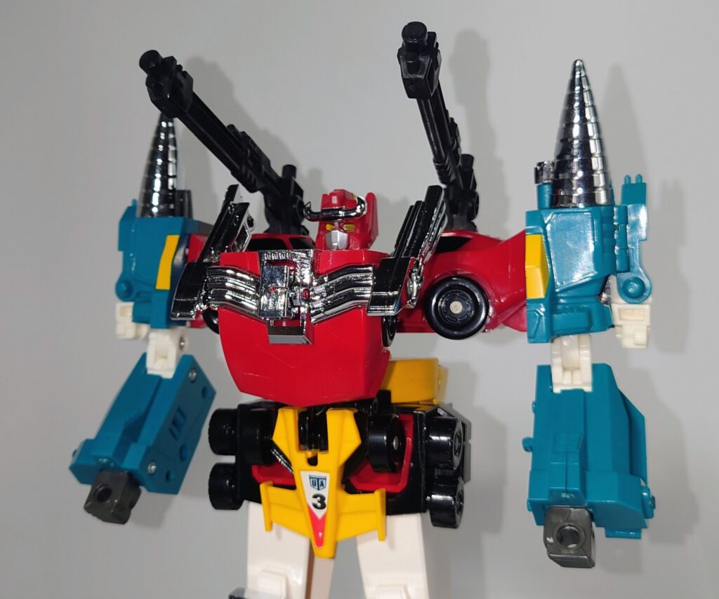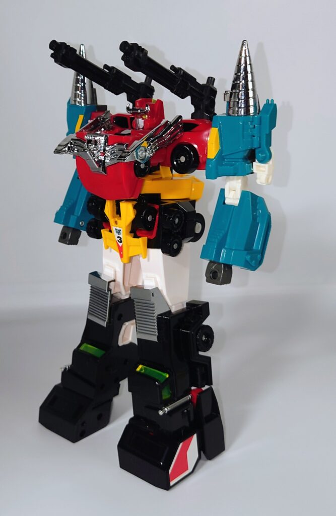 THE合体が発表されましたがオリジナルトイも素晴らしい完成度です。車両合体系のロボはカッコいいのが多いのですがここまでスタイルがよいのもあまりないと思われ35年ほど前のタカラの技術に驚愕するばかりです