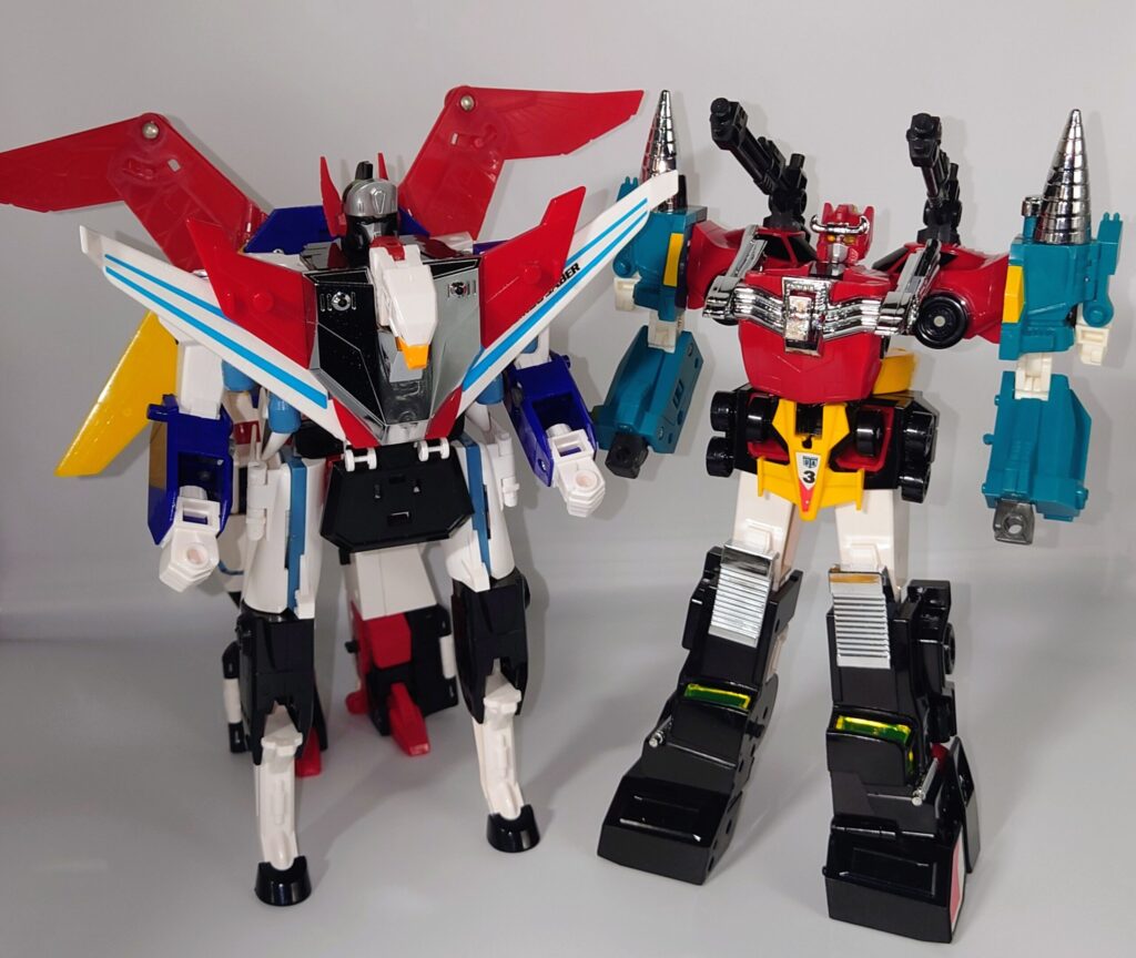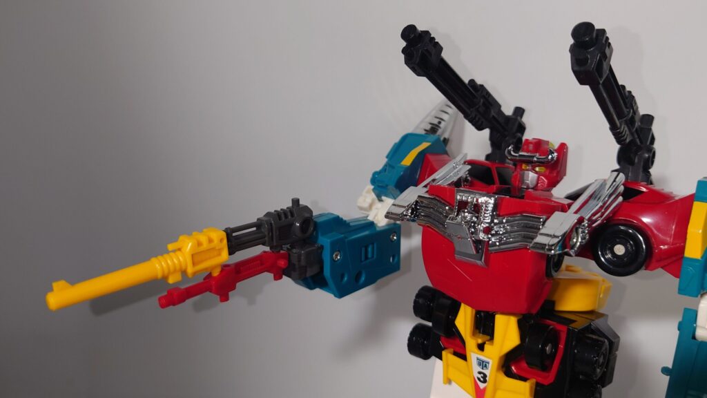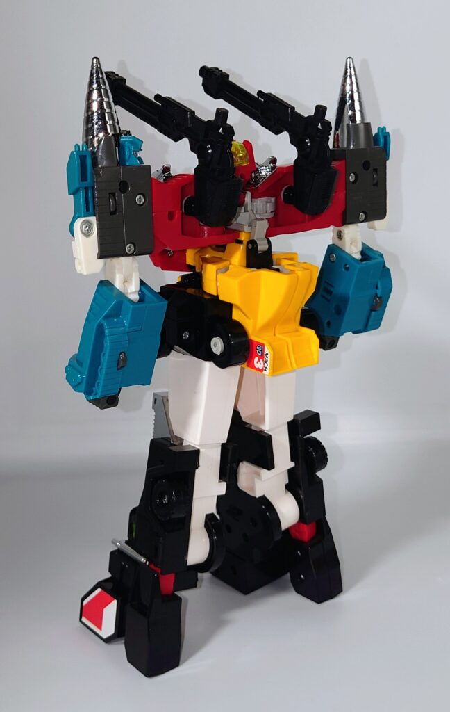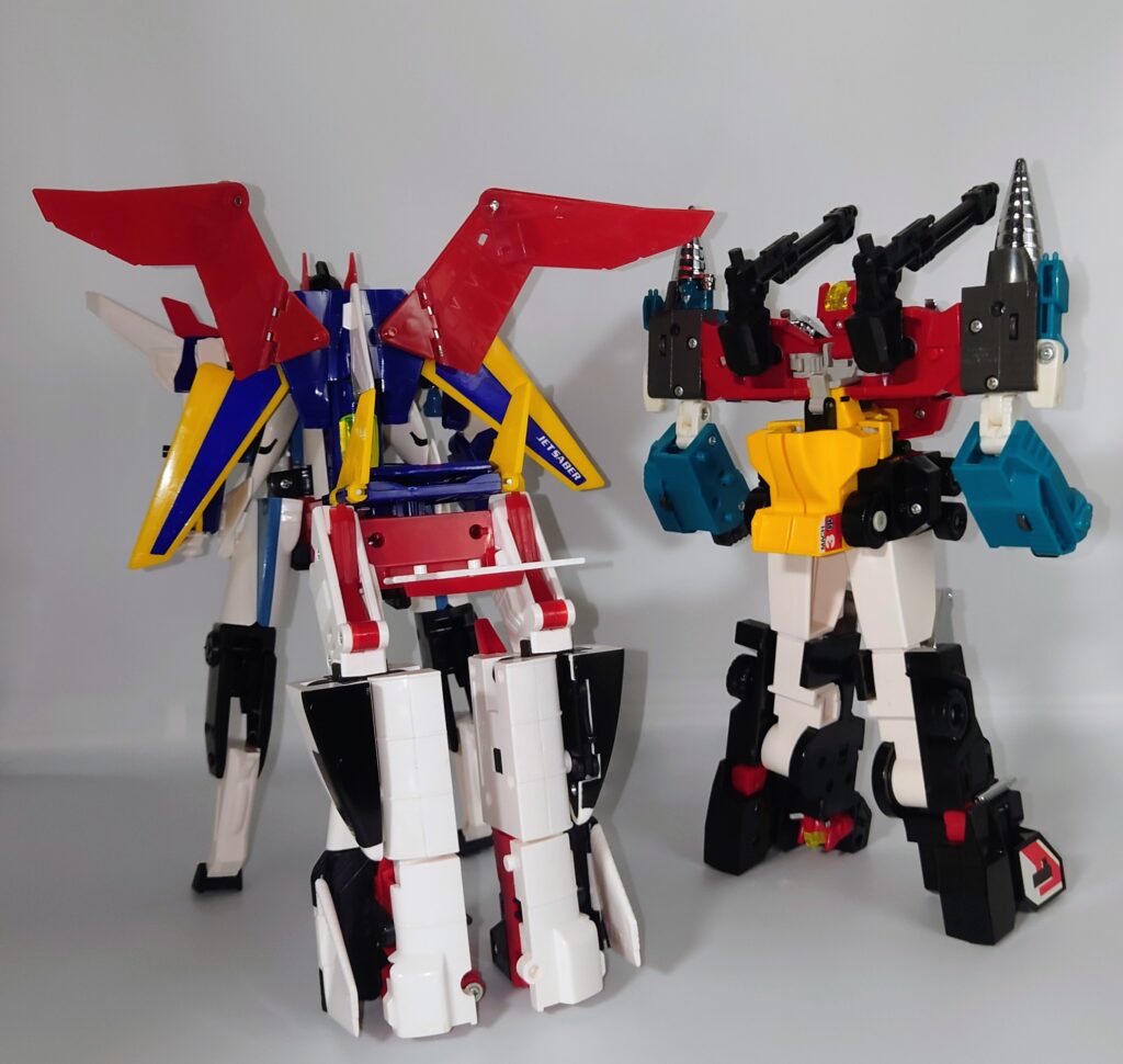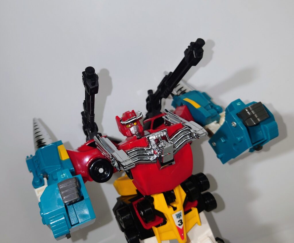 THE合体が発表されましたがオリジナルトイも素晴らしい完成度です。車両合体系のロボはカッコいいのが多いのですがここまでスタイルがよいのもあまりないと思われ35年ほど前のタカラの技術に驚愕するばかりです