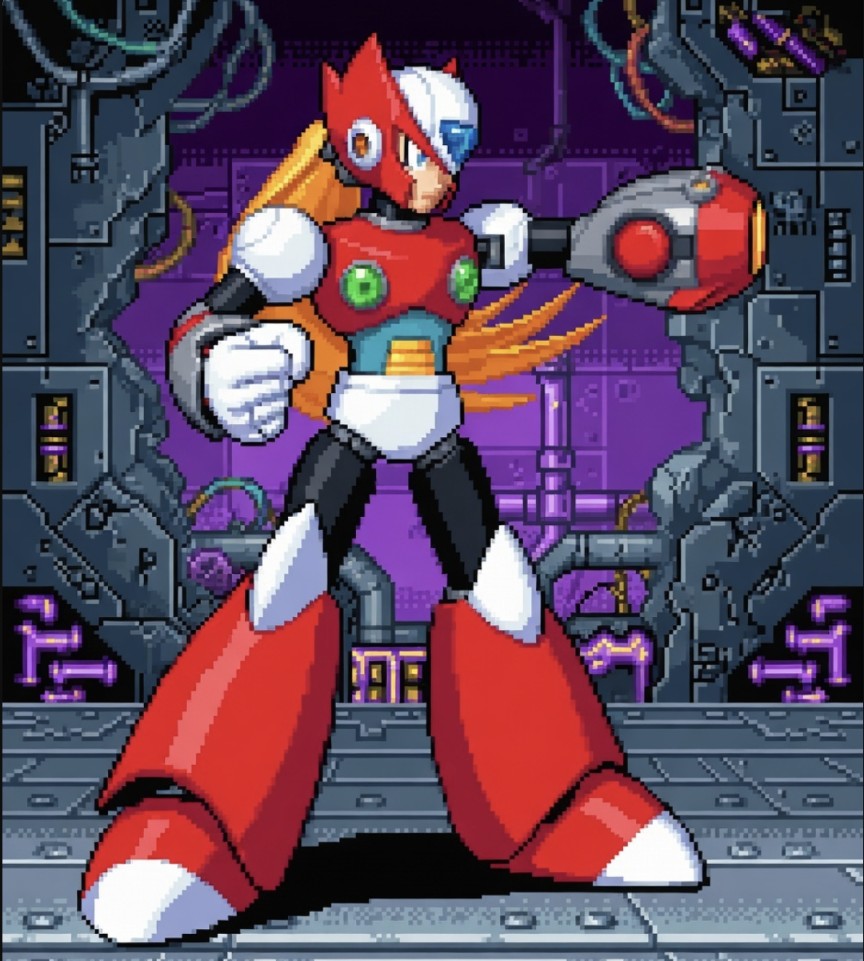 シリーズ1作目のゼロの姿。デザインはあの名言「どん判金ドブ」で有名な稲船敬二氏で最初はエックスではなくこっちを主人公にしたかった様子ですが、当時のロックマン初のスピンオフ作品でそういった冒険は許されずにお流れになった模様。稲船氏も思い入れがあるようでインタビュー等で度々名前の上がるキャラ