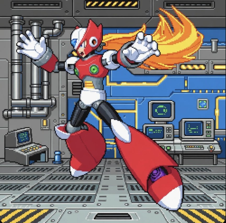 シリーズファンなら有名ですが、X2以降のゼロはサーゲスに改修されゼットセイバーが追加されたデザインになります。稲船氏は自分以外はゼロのデザインを変えるなと厳命されたそうですが『ロックマンゼロ』ではかなりリファインが入った姿になり、『X8』でも若干アレンジが入り細身の姿になりました