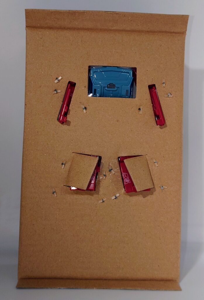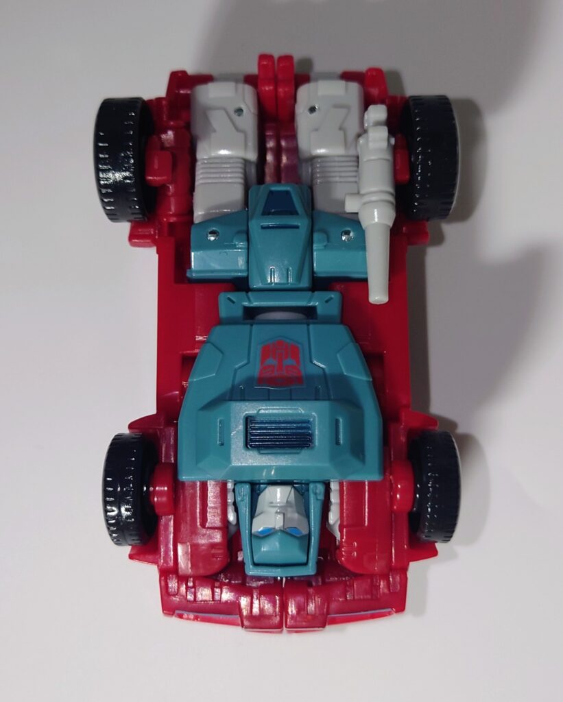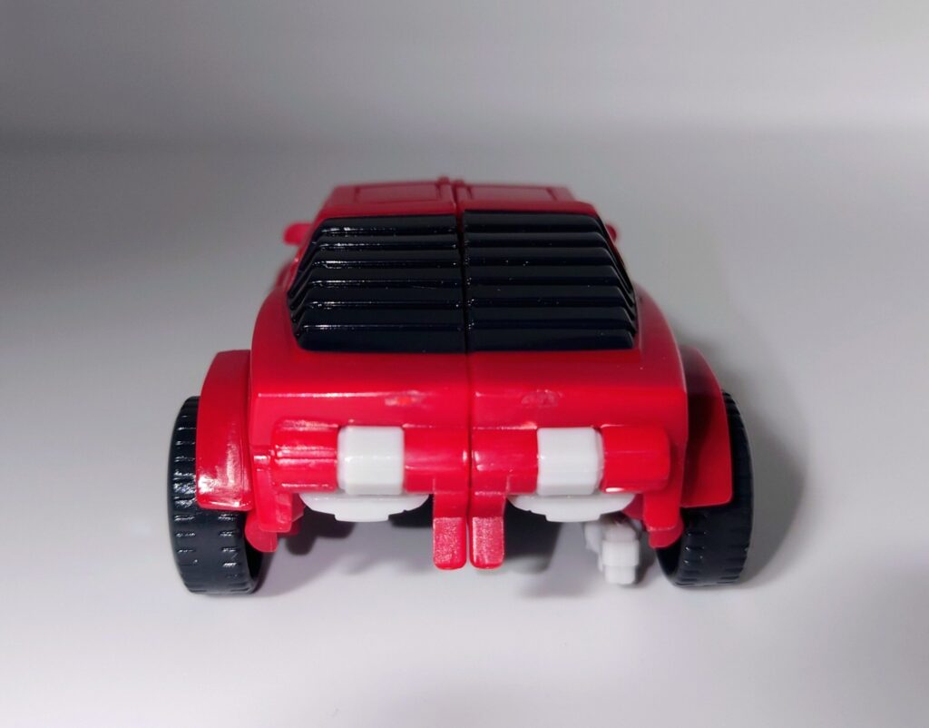 このチャージャーで素晴らしいのは前面から見るとタイヤが完全に隠れている点です。最初はミニボットベースだからと少し舐めてかかっていたので後に説明書を読み返して小柄なギミックに仕込まれた機構に感動したものですが、以降の画像に不完全な状態のものがあるのは申し訳ないです