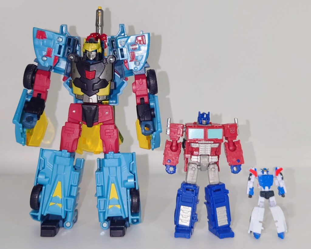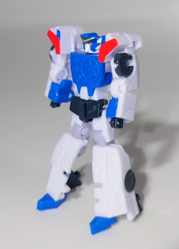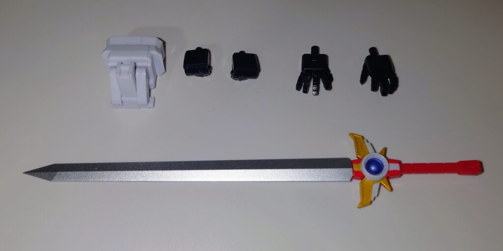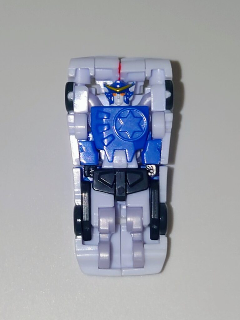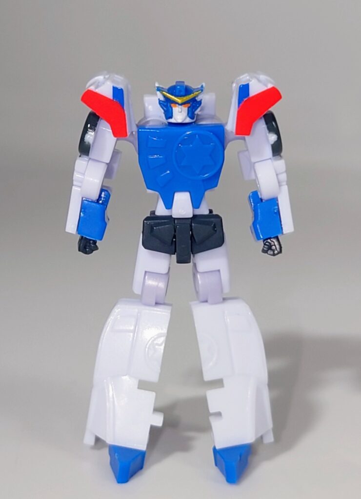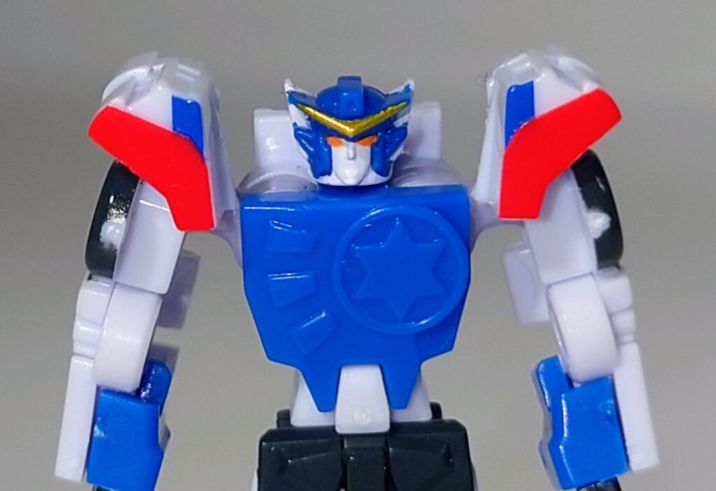 イケメンはやみんボイスのイケメン勇者。1話でちゃんと敵を単体撃破しそのカッコよさを視聴者に刻みつけた勇姿はコアロボとは思えないほどカッコいいです…が、元デザインでは肩が左右に張り出した形状ですが旧玩具よろしくナーフされた形状になっています