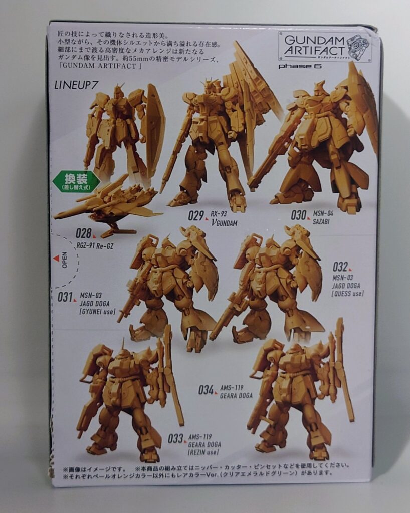 ガンダムアーティファクトに関しては前々から存在を知っておりV2アサルトバスターとZガンダムしか保有していませんでした。しかしながらとある書店でインパルスガンダムを手に取った際に偶然視界に入ったのが本キットでした。当然ながらνガンダム、サザビー、ヤクト・ドーガなどは抜かれていてリ・ガズィ、ギラ・ドーガ2種しかなかったのですが筆者的にはそちらの方に興味があったのでリ・ガズィのみ購入した次第です