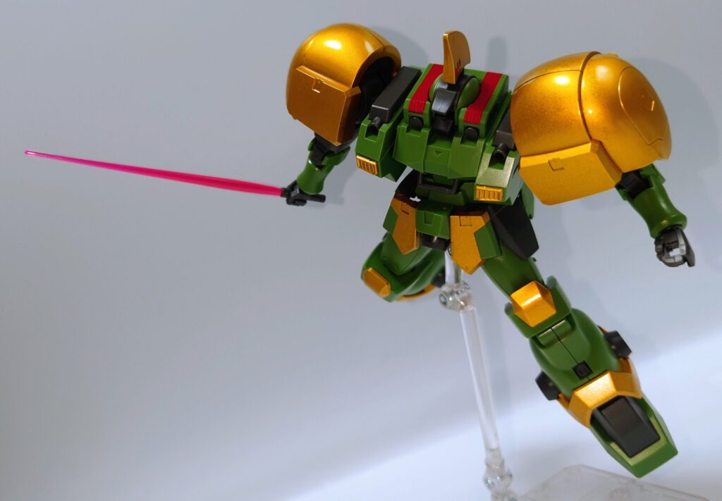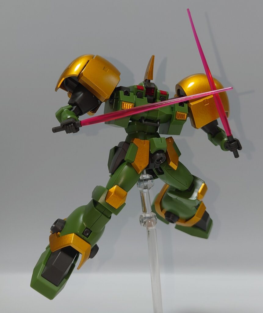実は機体金色をMrゴールド→クリアイエローで塗装しましたがゴールドがうまく乗らなかったため近くで見るとかなり荒い仕上がりに…他にもいくつかメタリックカラーを使用