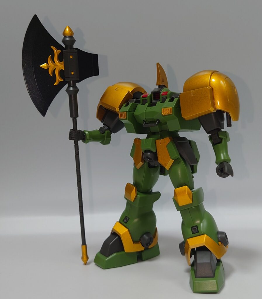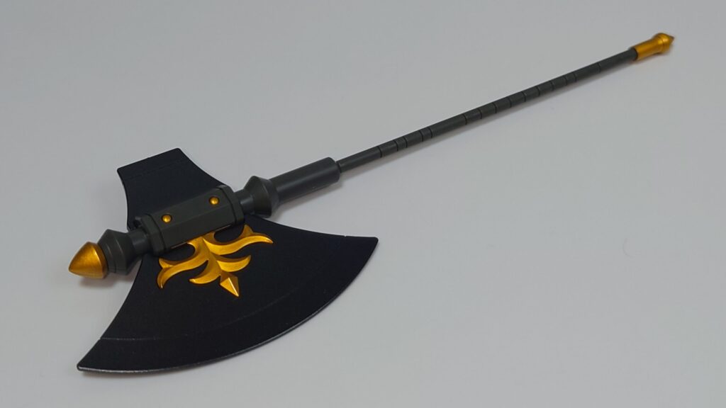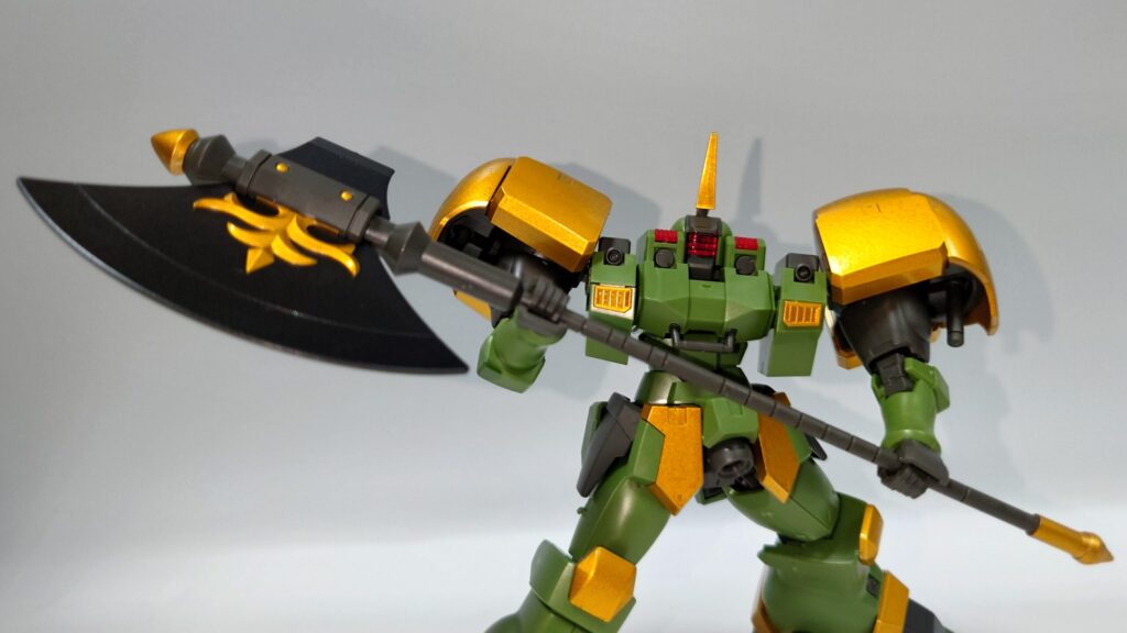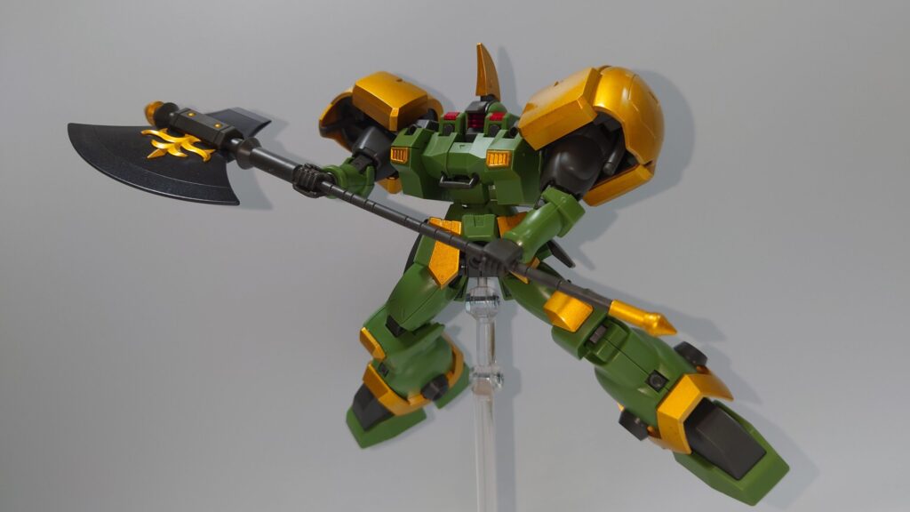 作中ではビームサーベルしか使用していないためプラモデル的なプレイバリューに欠けると思われたのか新規でウォーリアーアックスが付属。割と似合っています