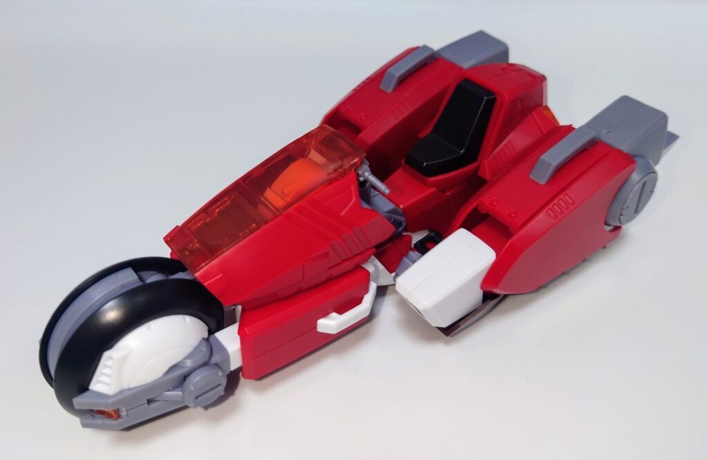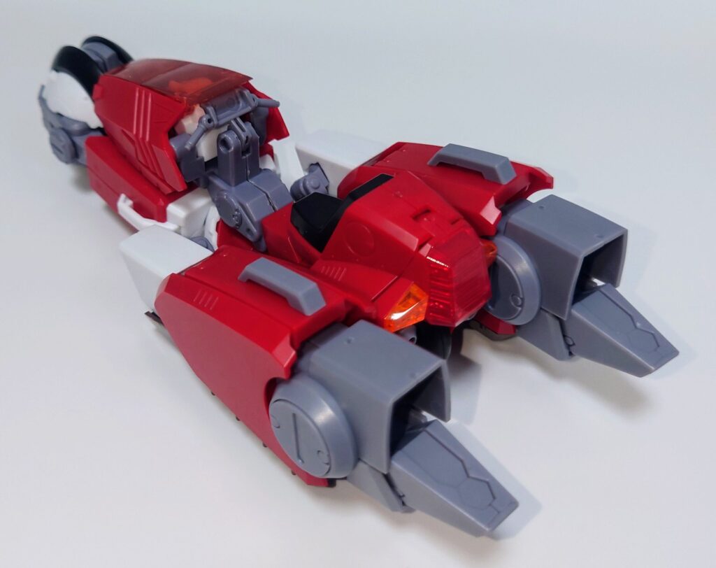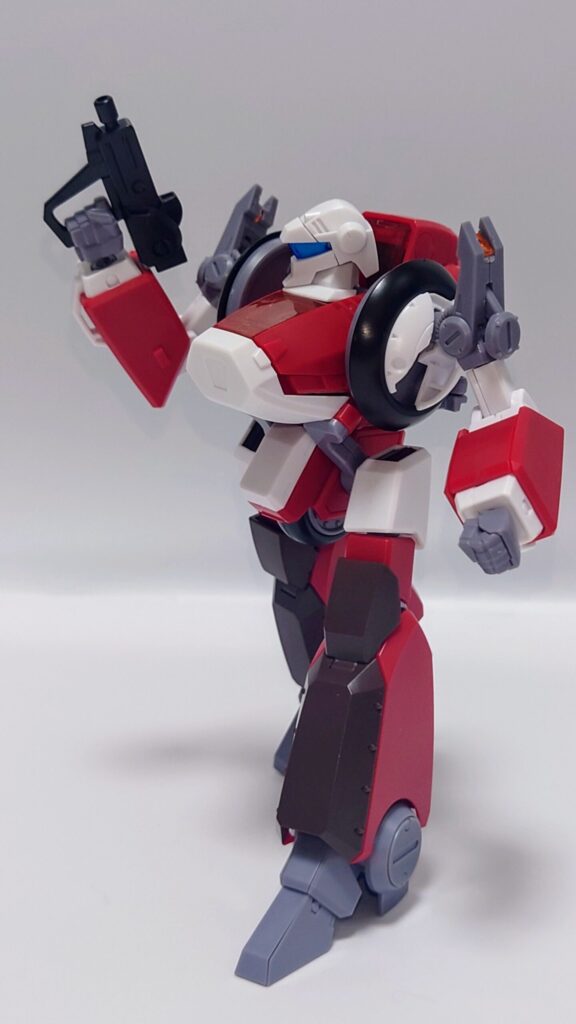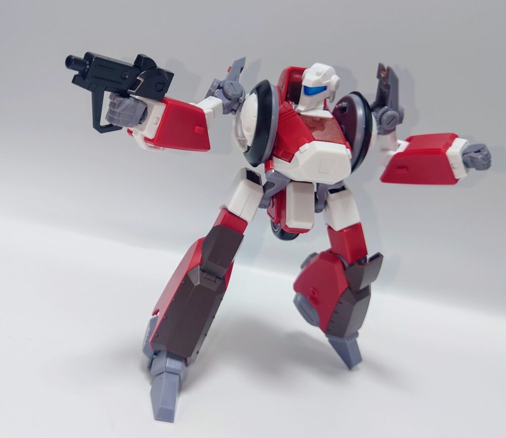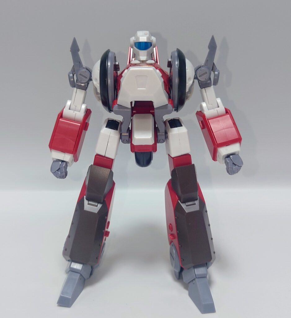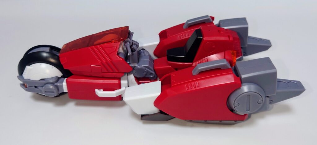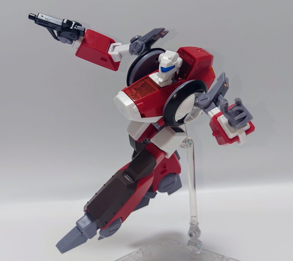 パッケージによる謳い文句通りに差し替え無しの変形が可能。デザイナーさん曰く、ちゃんと機構を考えてデザインしたとのこと。しかしながら大河原デザイン的なシンプルな機構ではなくハイエイジトイなどで見る細いフレームを中継させてのパーツ移動も確認できます。作中で印象的だった省吾を乗せたままの変形は残念ながら不可能