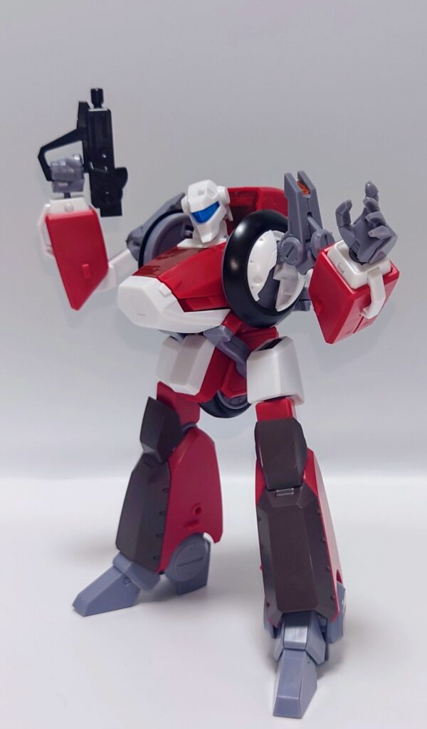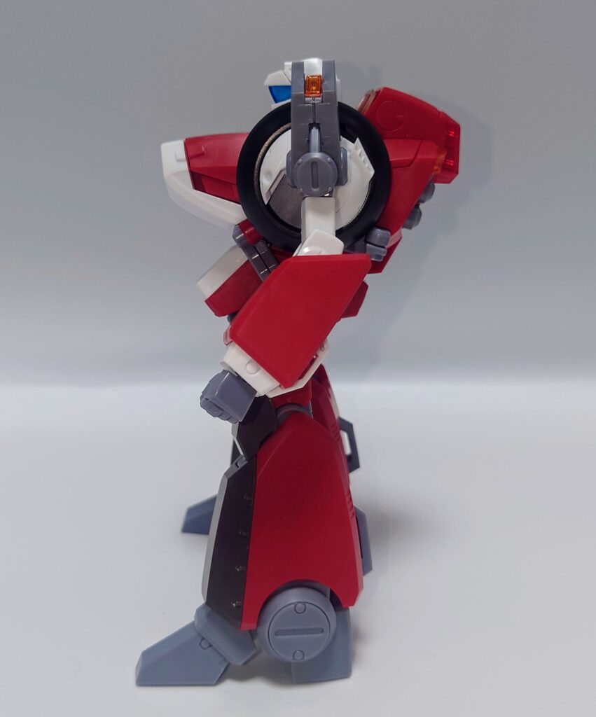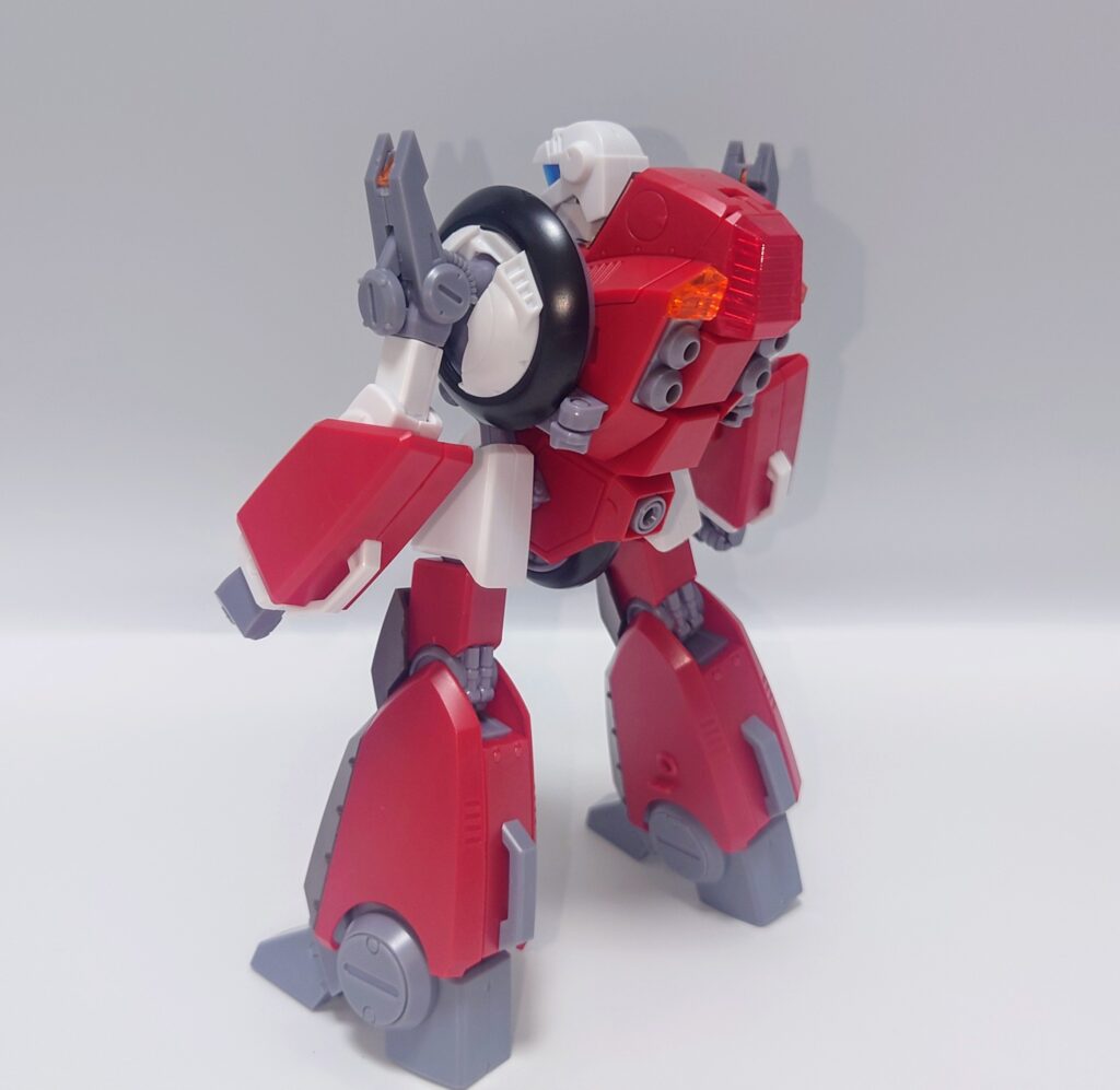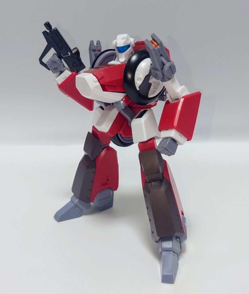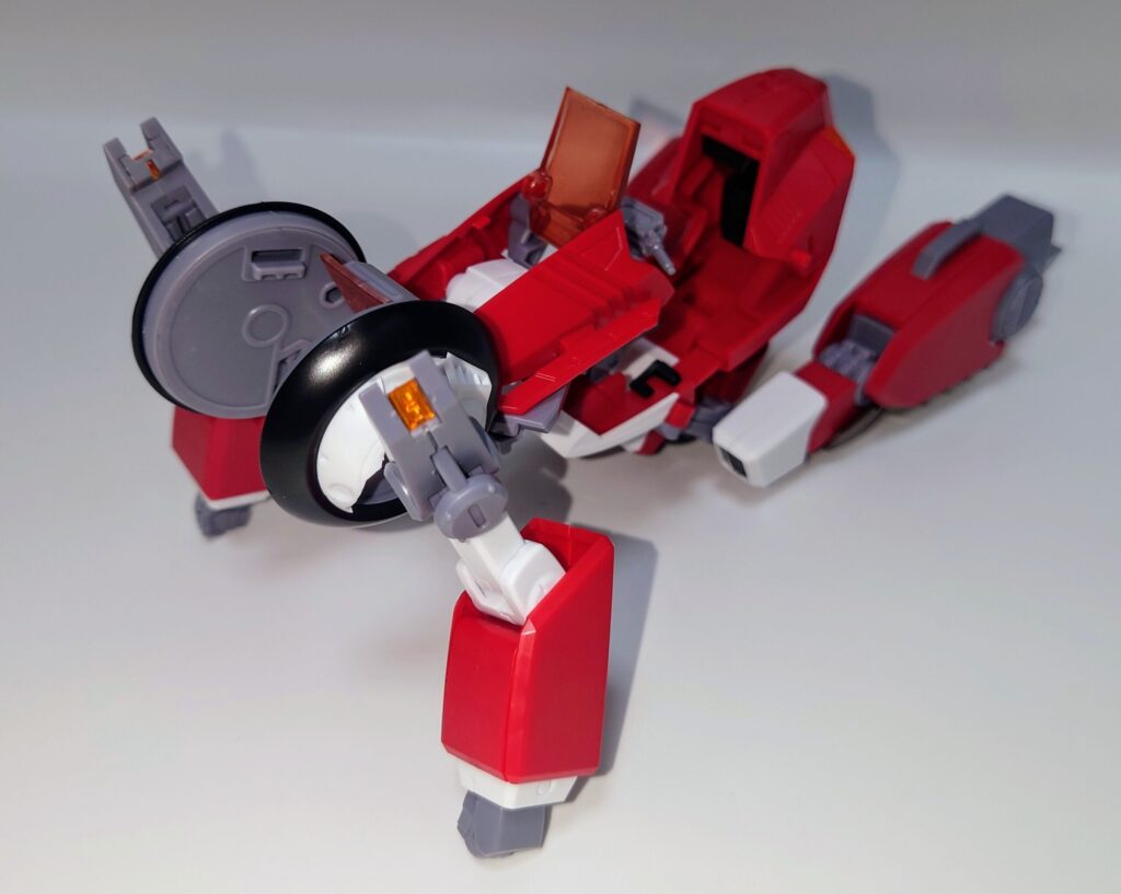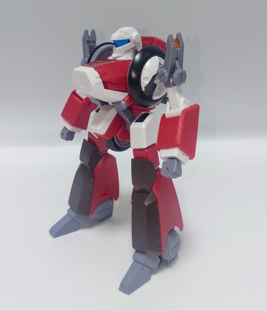 パッケージによる謳い文句通りに差し替え無しの変形が可能。デザイナーさん曰く、ちゃんと機構を考えてデザインしたとのこと。しかしながら大河原デザイン的なシンプルな機構ではなくハイエイジトイなどで見る細いフレームを中継させてのパーツ移動も確認できます。作中で印象的だった省吾を乗せたままの変形は残念ながら不可能