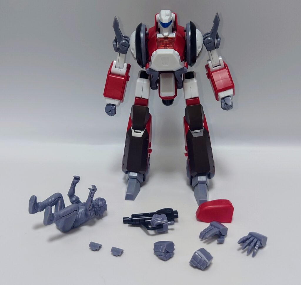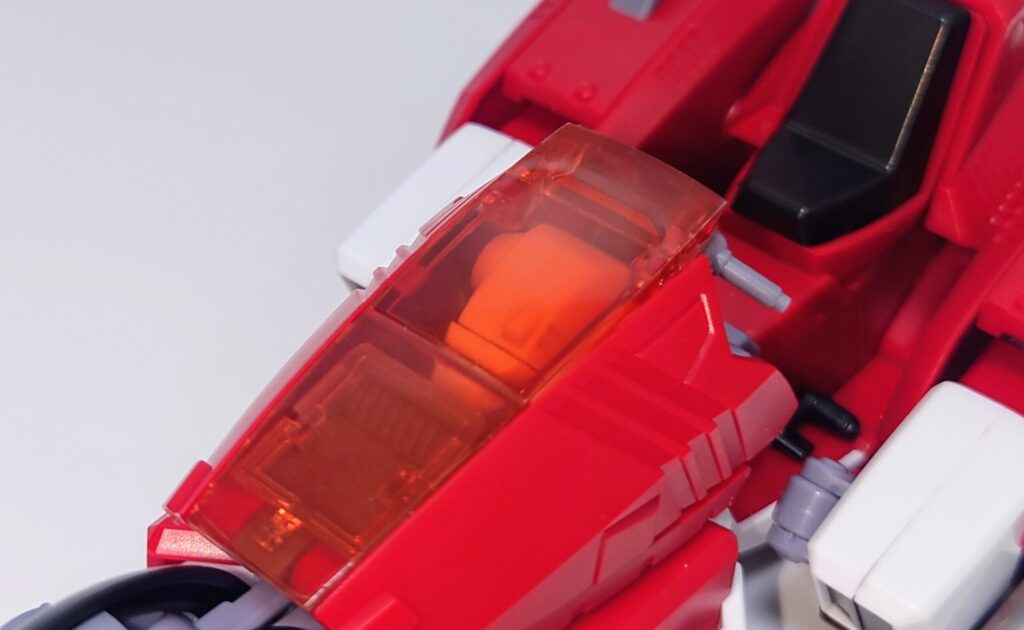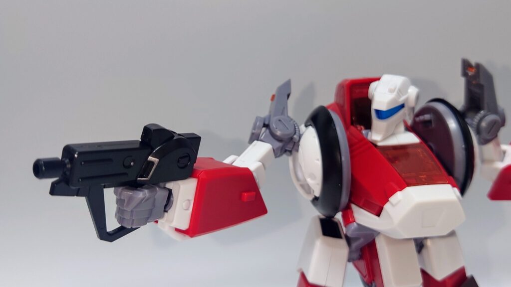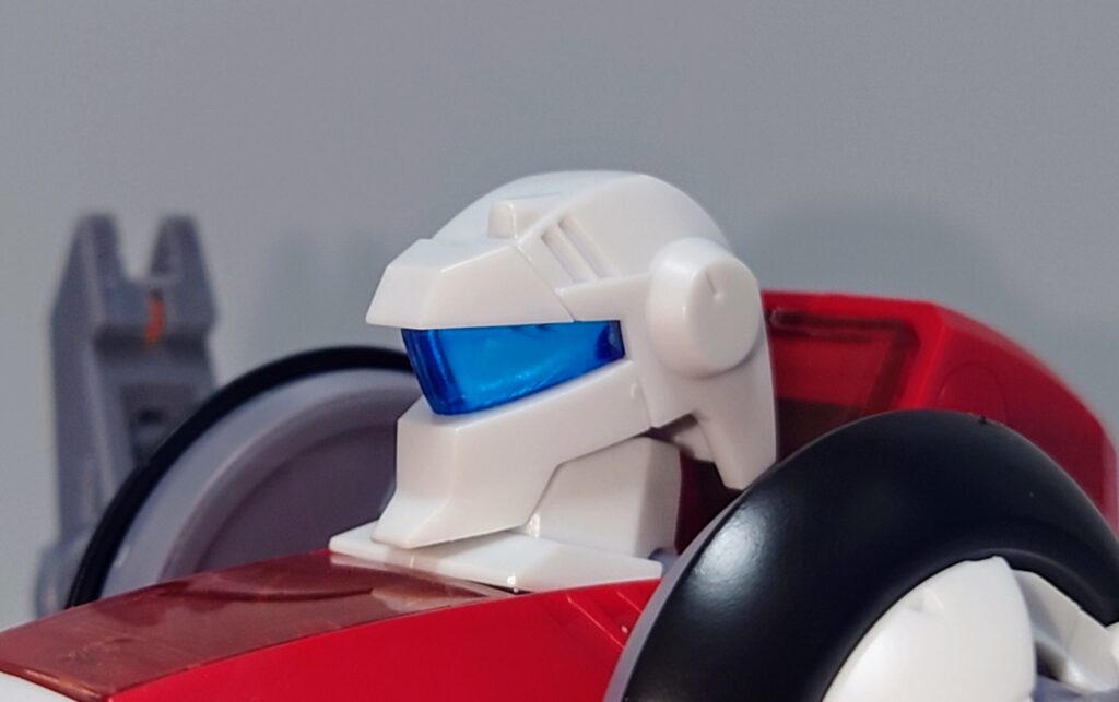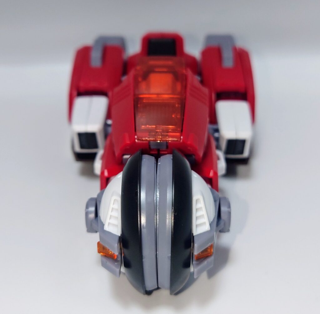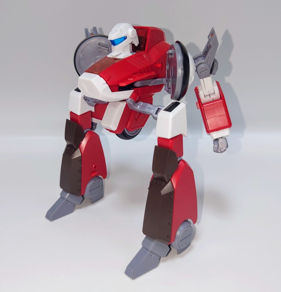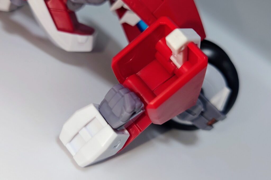 パッケージによる謳い文句通りに差し替え無しの変形が可能。デザイナーさん曰く、ちゃんと機構を考えてデザインしたとのこと。しかしながら大河原デザイン的なシンプルな機構ではなくハイエイジトイなどで見る細いフレームを中継させてのパーツ移動も確認できます。作中で印象的だった省吾を乗せたままの変形は残念ながら不可能