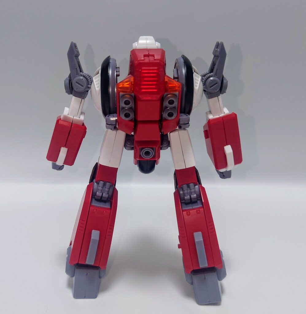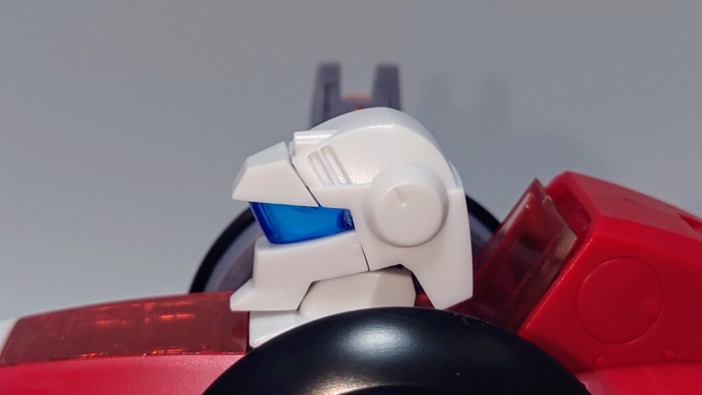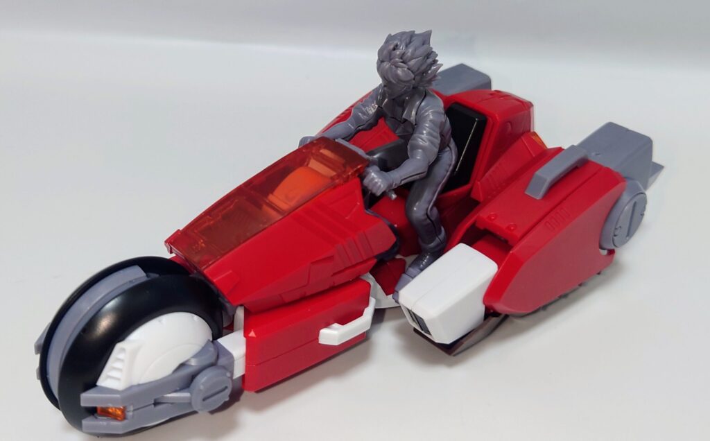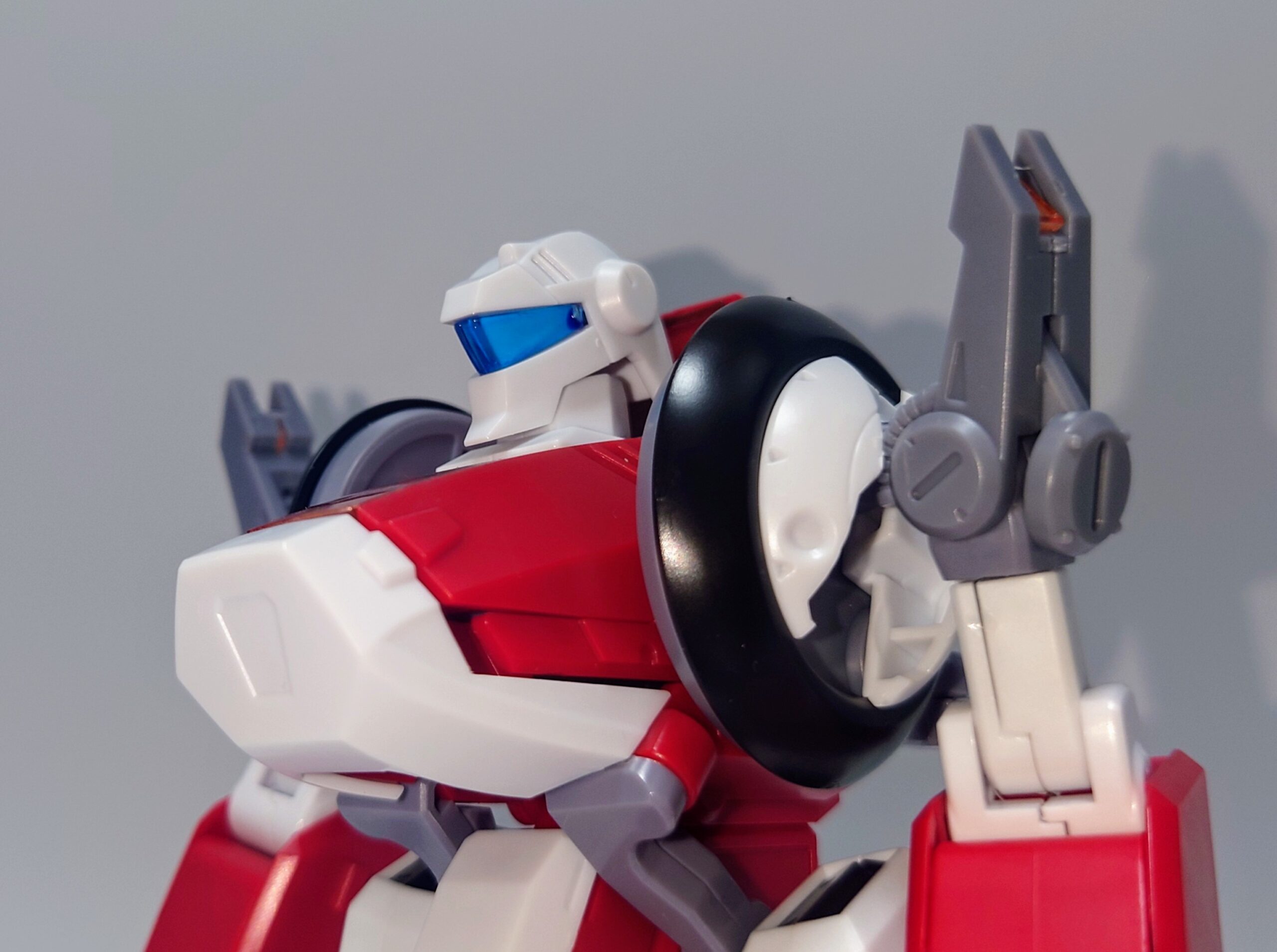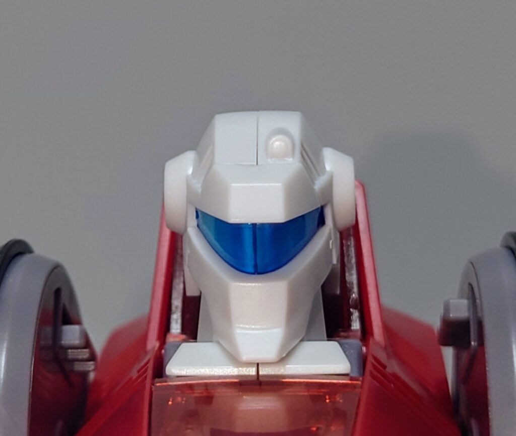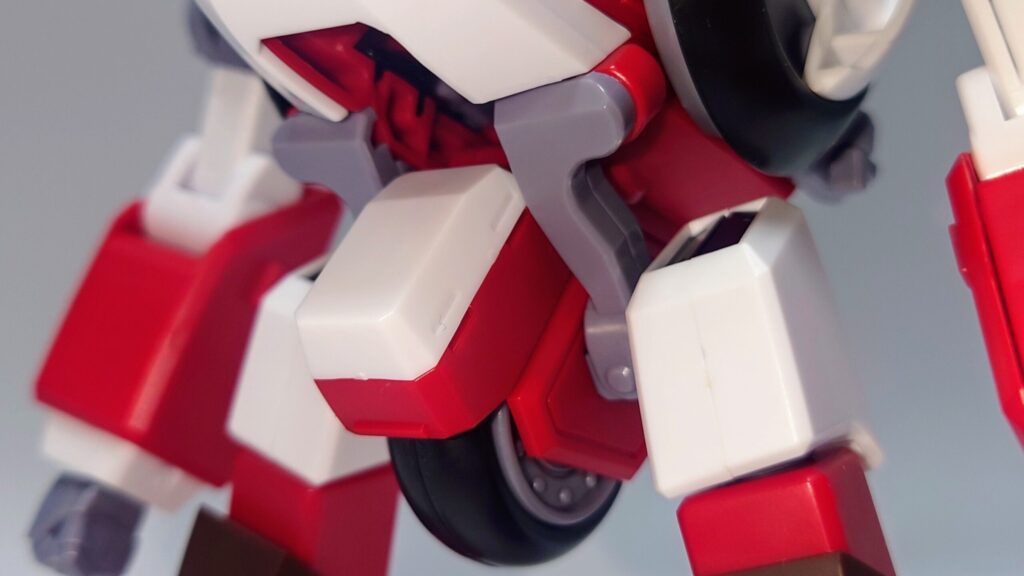 パッケージによる謳い文句通りに差し替え無しの変形が可能。デザイナーさん曰く、ちゃんと機構を考えてデザインしたとのこと。しかしながら大河原デザイン的なシンプルな機構ではなくハイエイジトイなどで見る細いフレームを中継させてのパーツ移動も確認できます。作中で印象的だった省吾を乗せたままの変形は残念ながら不可能